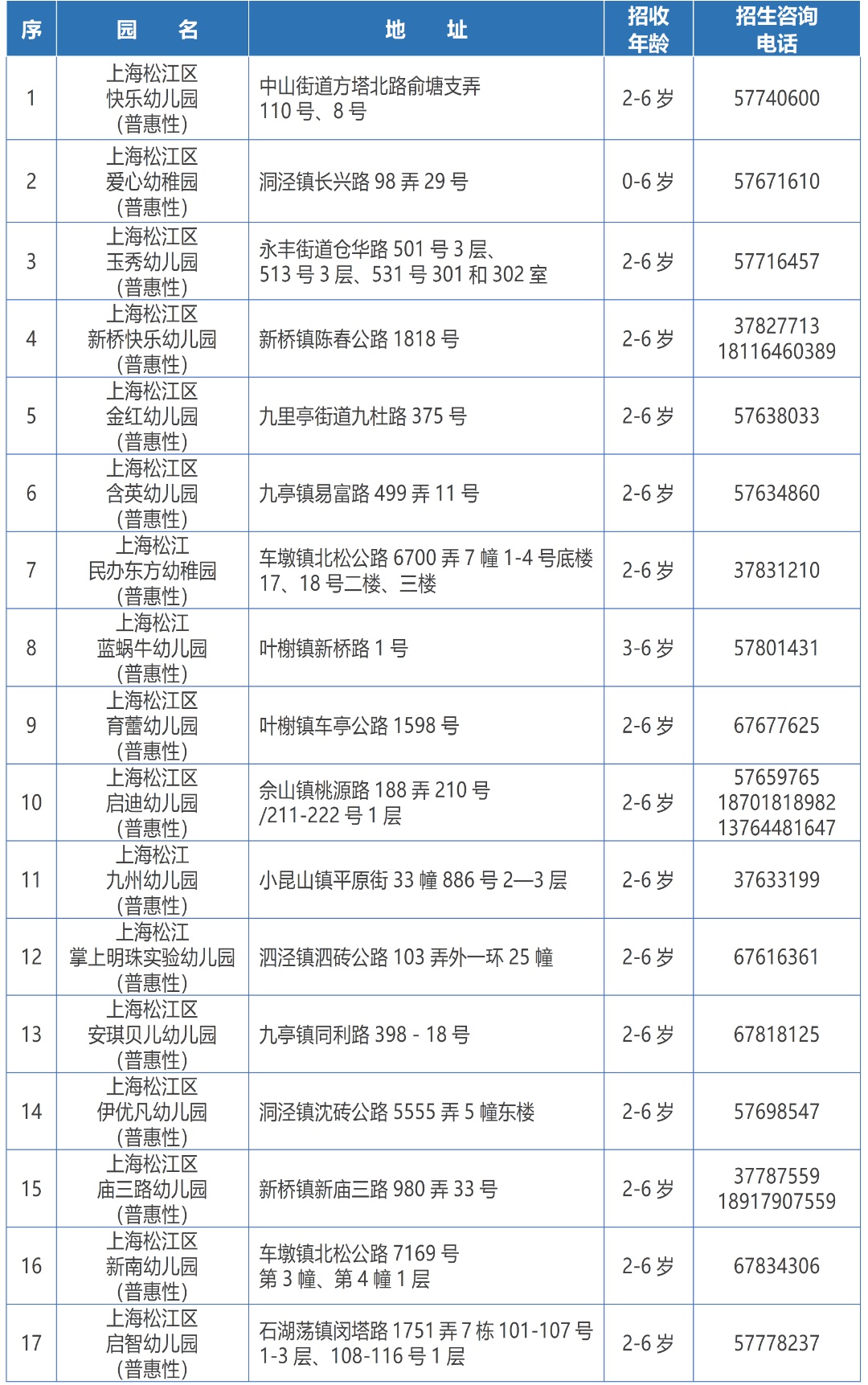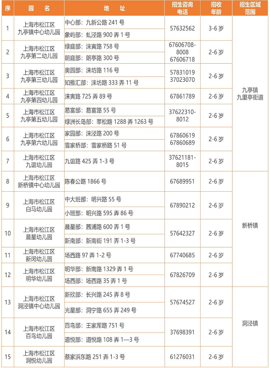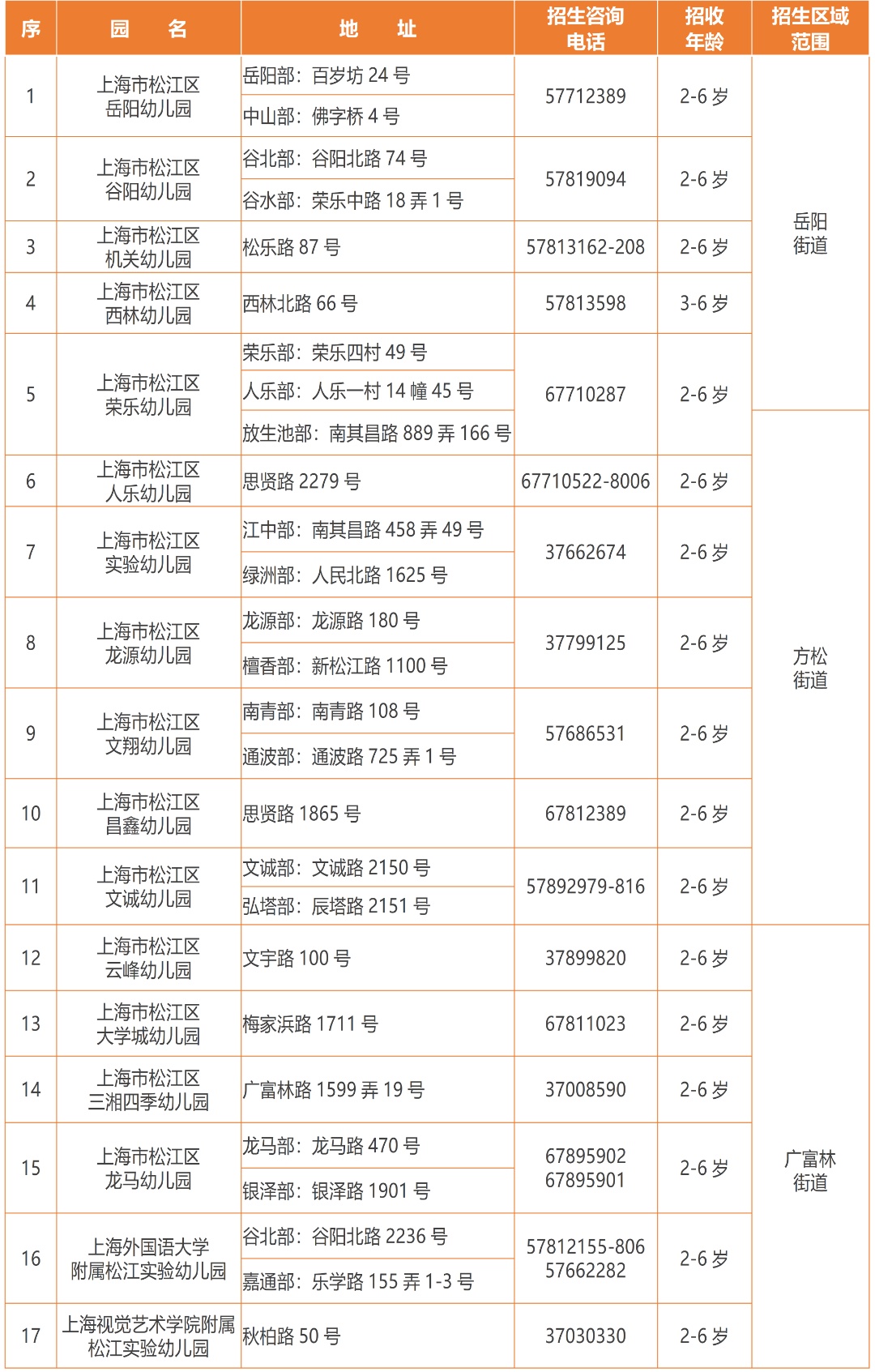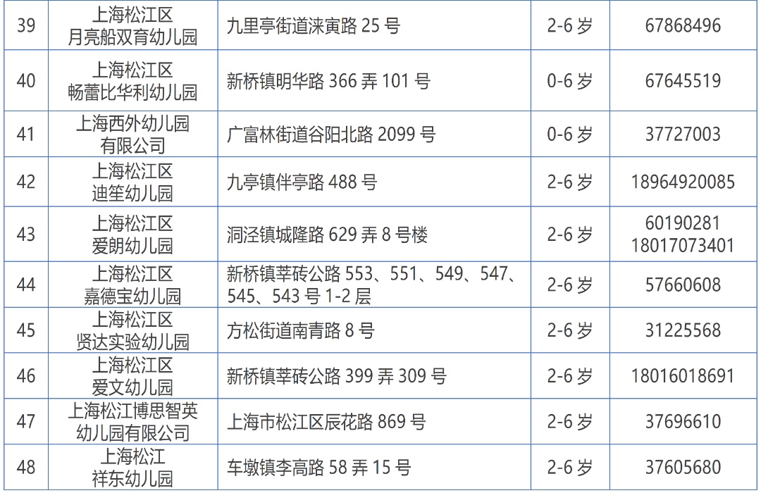 (三)本区学前教育阶段招生咨询电话:57830651、57830613(托幼中心),37736356(托幼与学前教育科);电话咨询时间:9:00—11:30、13:30—16:00;咨询地址:茸吉路287弄1-4号(松江区托幼服务指导中心),线下咨询时间:周二—周四13:00-15:00(寒暑假除外)。