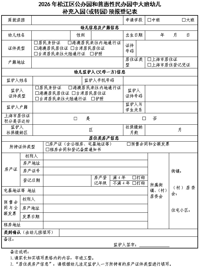 详见《2026年松江区中大班幼儿补充入园(或转园)须知》(附件5)。