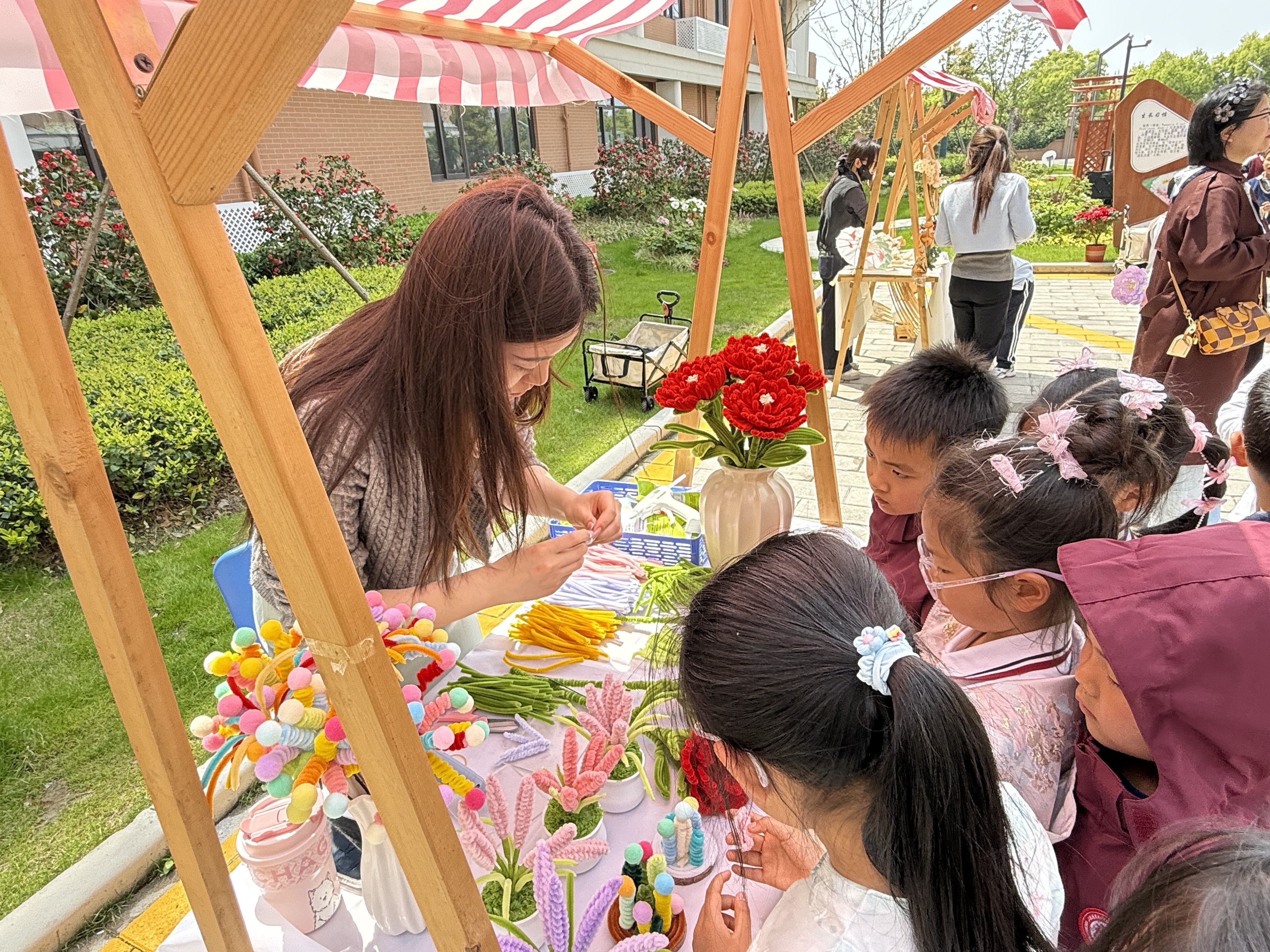 园内的传统文化展示市集更是热闹非凡,从牡丹园延伸至操场,投壶、射箭、舞龙等传统体育项目吸引学生们竞相体验,欢呼声不绝于耳;学生自制的国风手作、书画文创琳琅满目,创意十足;才艺展示区里,歌声、琴声、掌声交织,成为春日校园里最美的交响。