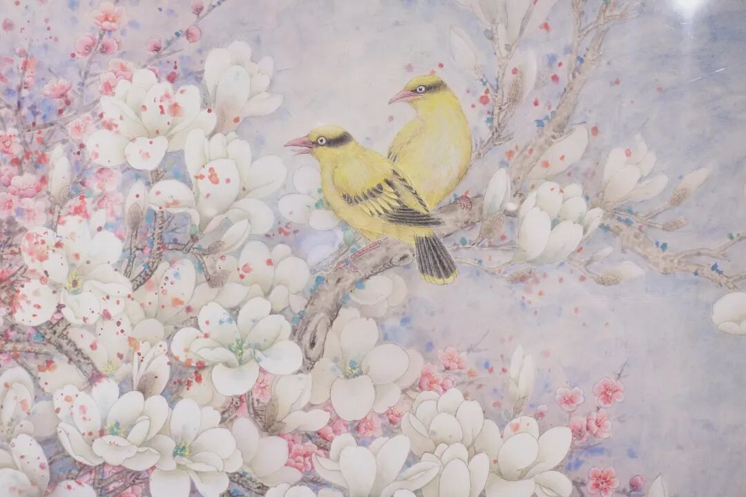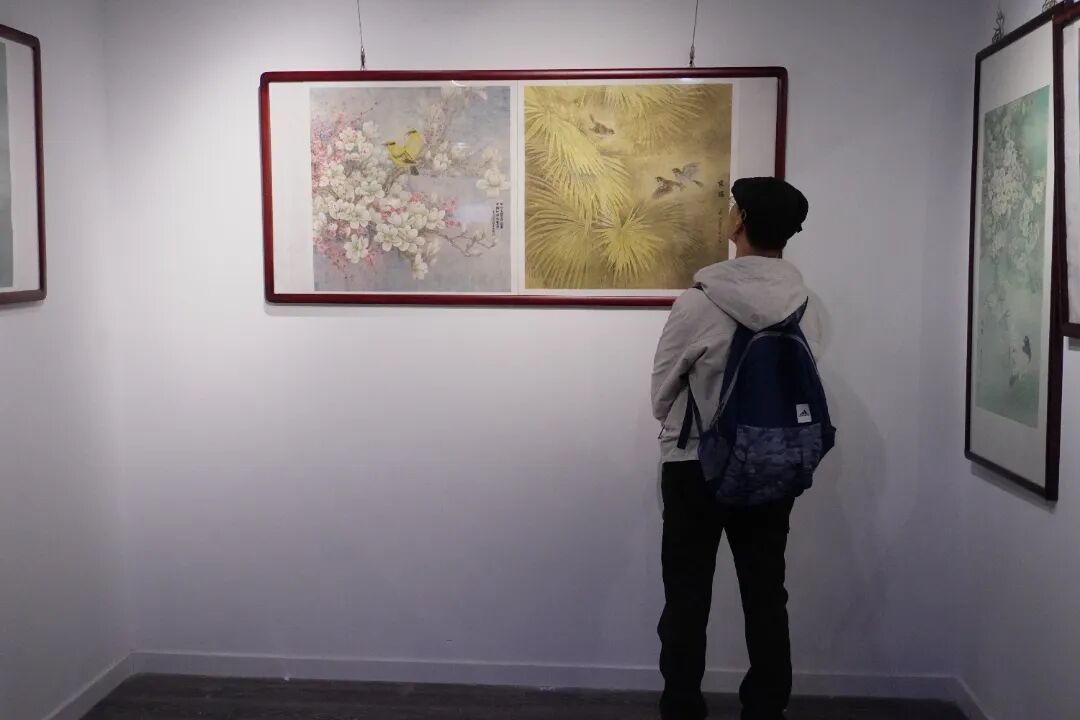 本次展览的28幅作品,以“春天”与“马到成功”为核心脉络,串联起四季生机与时代气象。《上海之春》里,玉兰花枝舒展,群鸽振翅于暖橙底色之上,冷暖对比的色彩让传统工笔焕发现代活力;《碧水传香知鱼欢》中,锦鲤逐波、牡丹含露,虚实相生的笔触里藏着印象派的朦胧意趣;骏马主题作品中,《柳荫双骏图》的奔马踏春而来,鬃毛飞扬间尽展“马到成功”的昂扬气象。无论是牡丹的雍容、玉兰的清雅,还是游鱼的灵动、骏马的飒爽,都在他的笔下被赋予了鲜活的生命力。