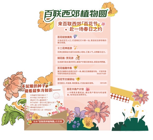 以“春日之约”为纽带,将百联西郊“植物圆”与中山公园相联结,打造上海国际花卉节上的双园联动自然美陈场景。展区依托种子博物馆的生命底蕴,以春日花车为视觉焦点,融合趣味科普、主题导览与社群互动,在城市公园中营造出兼具治愈感与生机活力的氛围。