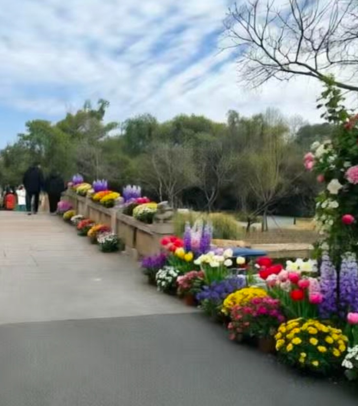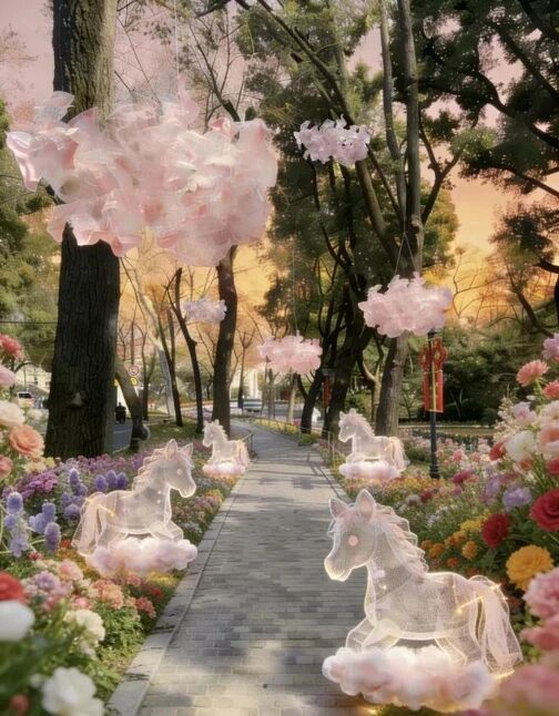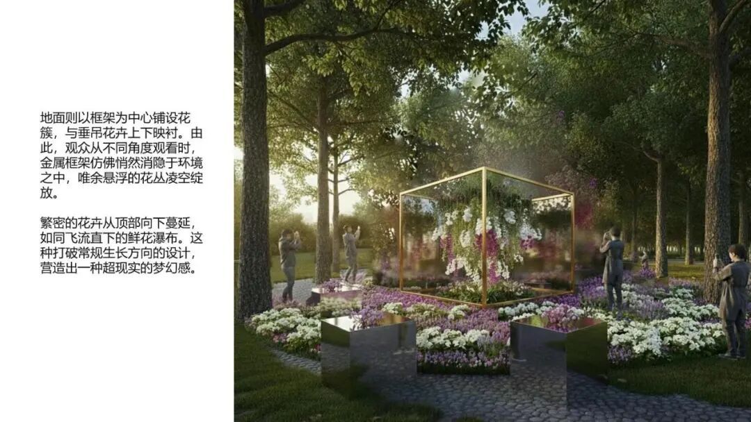 该作品以简洁的构架撑起一片花境。花卉沿地面铺展,花枝自头顶垂落,上下连成一体,营造出沉浸式的花间氛围。花瀑倾泻而下,兼具热烈与梦幻气息;几面镜立方散落于林间,映照出树影与天空,虚实交错,形成别致景观。金属线条隐于花丛之中,仅留花朵凌空盛放。作品邀请市民游客走进林间,在花影中感受春日的轻松与愉悦。