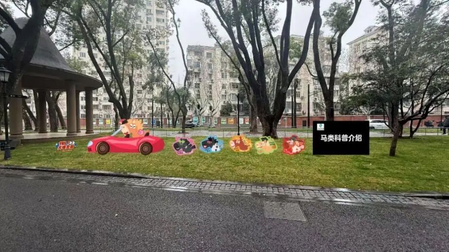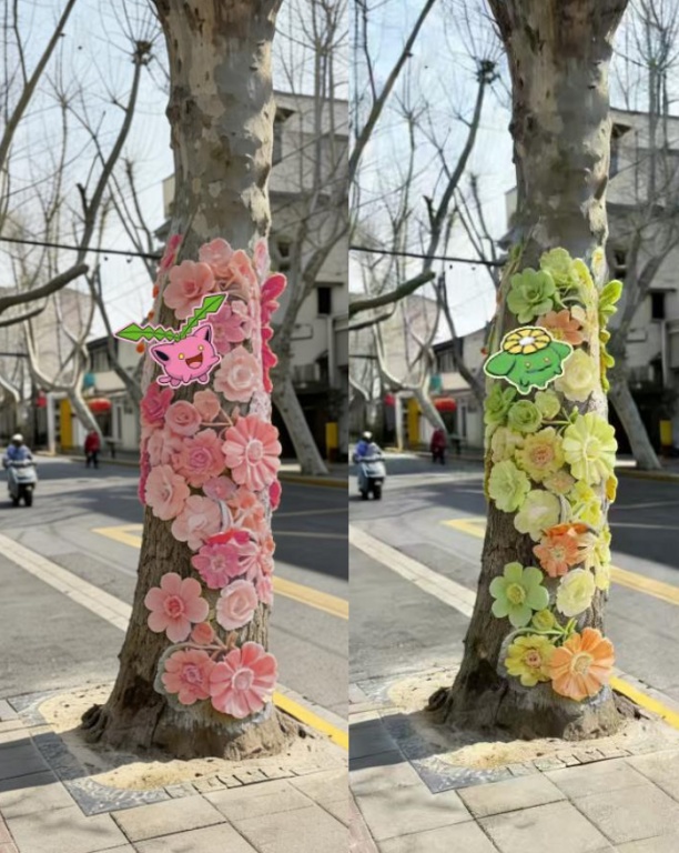 沿着愚园路的林荫步道,以布艺花卉为语言,将春意轻轻缠绕于树干之上。柔软的织物花瓣层层铺展,与真实树皮的肌理形成温暖对话;不同精灵形象点缀其间,或探出花丛或俏皮停驻,仿佛在城市街景中悄然苏醒。让愚园路成为一条可阅读、可互动、可打卡的花系漫步长廊。