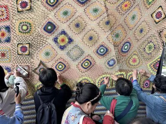 作品以网状结构打造“倒置山水”,观众步入其下如临群山之底。塑料花卉汇聚于倒挂山峰顶端,蝴蝶点缀于网面,形成“重密”与“轻疏”的对比,邀请市民游客在色彩与网格中重新感知自然。