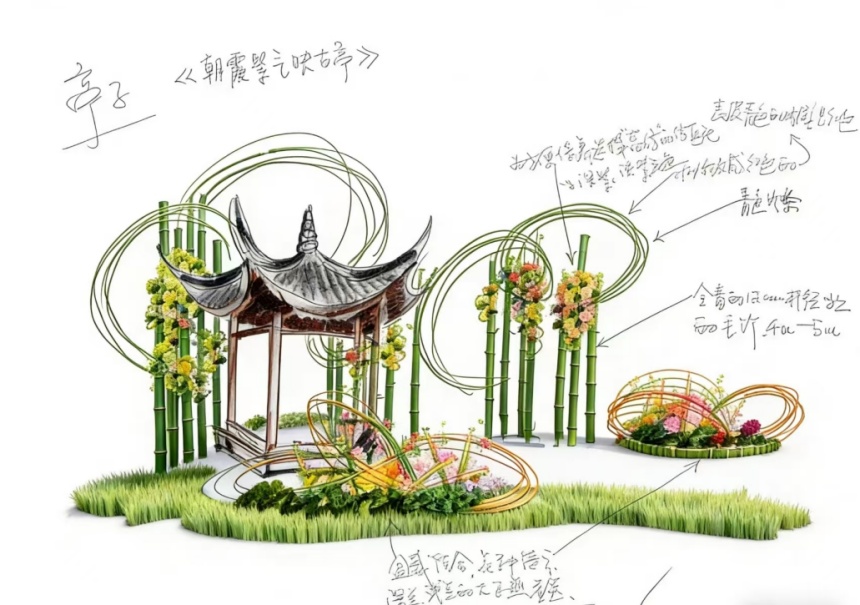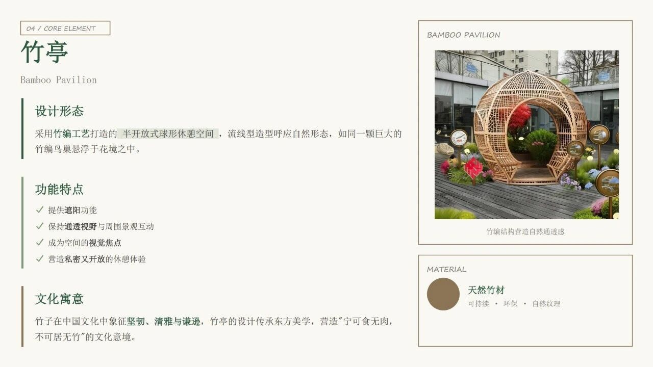 作品以 “竹” 为古亭核心元素,巧融“吉祥”之意象,层层烘托古亭悠然意境。作品以竹为线条,勾勒空间风骨,于虚实之间,抽象演绎历史文脉与现代生活的传承纽带,让君子风骨与人间温情在此相融共生。