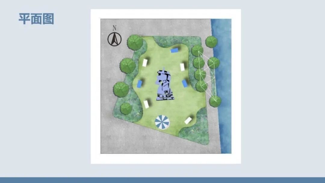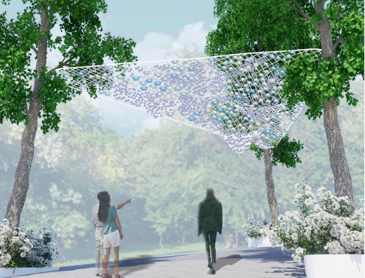 本作品以“云”为形,以“躺”为魂,旨在快节奏的都市缝隙中,开辟一片让心灵 “躺赢” 的柔软之地。设计灵感源于“天光云影”,在三角形草坪与林荫路两侧,通过蓝白色系花境模拟空中云朵的飘逸与宁静。草坪中央的“懒云朵”沙发与树木间悬浮的“云网”上下呼应,将天空具象化为可触摸、可躺卧的实体空间,让市民游客可以在此间或躺或坐,视线穿过花海望向树影间的天空,实现精神的轻盈放空,寻找属于自我的那份 “云端治愈”。