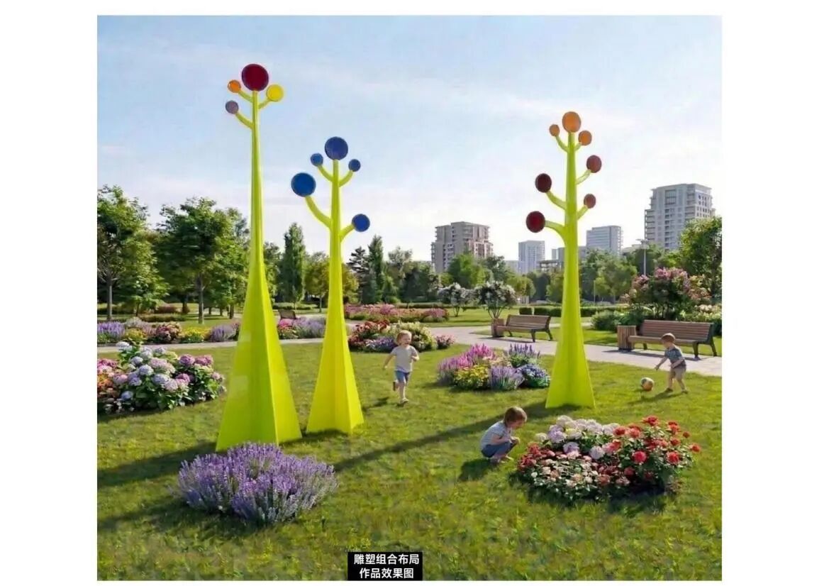 作品以三棵花树为核心,暗合“三生万物”哲思,既是森林的缩影,更是生生不息的象征。在树下栖息、在花间穿行,每个生灵都能从花树中汲取能量。向阳绽放的花朵连接林间生灵,传递万物共生、彼此滋养的生命美学,以温柔低语诉说自然生生不息的奥秘。