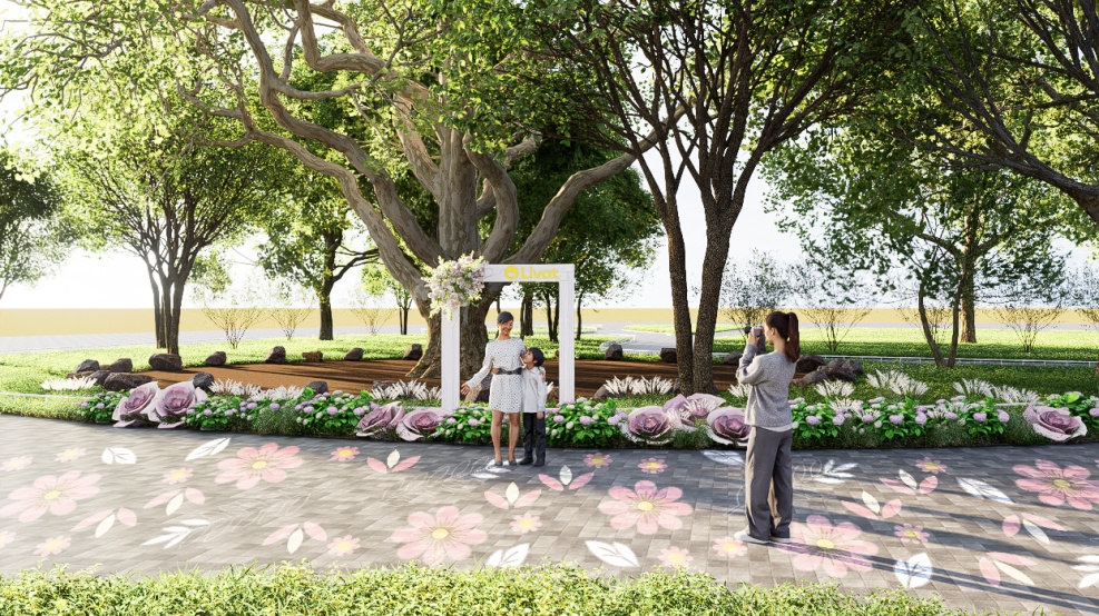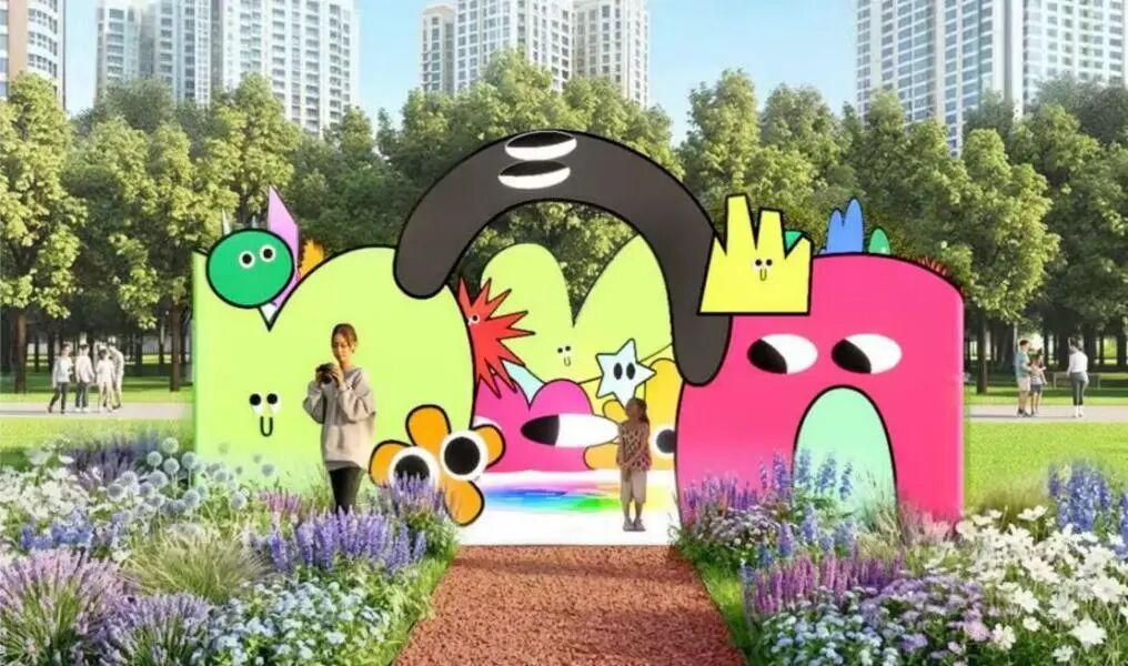 花境以环形花带为骨架,将层层叠叠的粉色花簇织入绿意之中,如同春日缓缓旋开的花冠。中心以花环拱门与IP形象为视觉焦点,营造可步入、可环绕、可停留的沉浸式花境空间,使每一次驻足都成为与花对话的仪式。花丛高低错落,色彩由浅入深,宛若城市心跳在绿地间轻轻荡漾。人们可循着环形花径缓步而行,在繁花环抱中与IP精灵相遇、合影,将春日的柔软与童趣收入镜头。