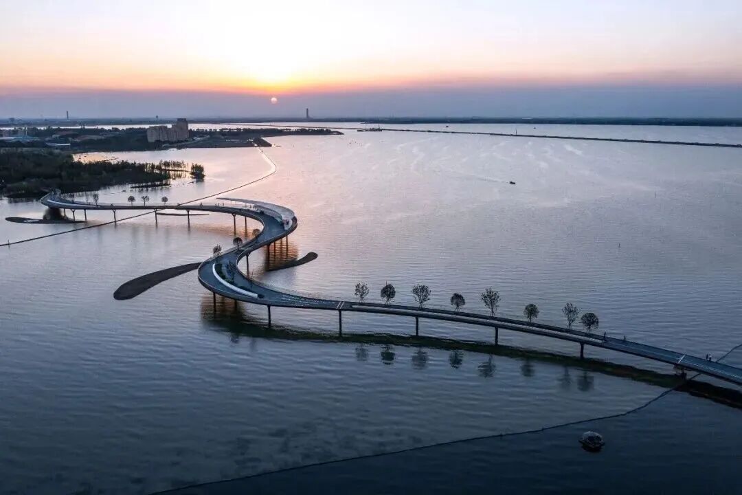 元荡慢行桥曲线造型超上镜。平整的骑行道一路串联起生态美景,累了就去驿站歇脚,服务也很贴心。