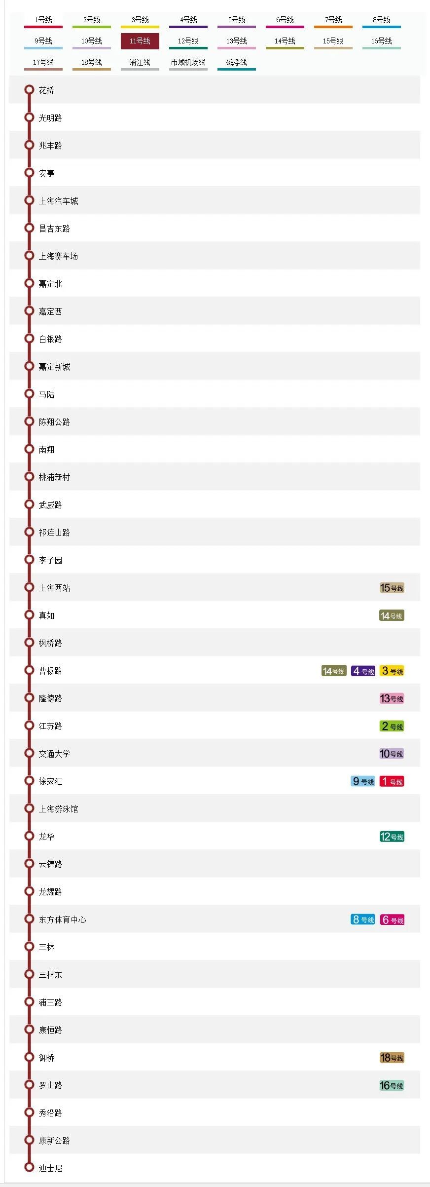 11号线呈“西北—东南”走向,线路主线起自嘉定区嘉定北站,途经普陀区、长宁区、徐汇区,终点止于浦东新区迪士尼站,支线西起江苏省昆山市花桥站,终点止于嘉定区嘉定新城站。