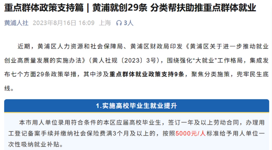 2023年黄浦区发布了促进就业29条政策,明确用人单位录用符合条件的黄浦户籍应届高校毕业生并满足社保缴纳要求后,可申请每人5000元的一次性吸纳就业补贴。政策本身力度不小,但若要拿到补贴,需要企业主动提交材料、走审核环节——流程虽不算烦琐,却仍需企业主动“跑腿”。