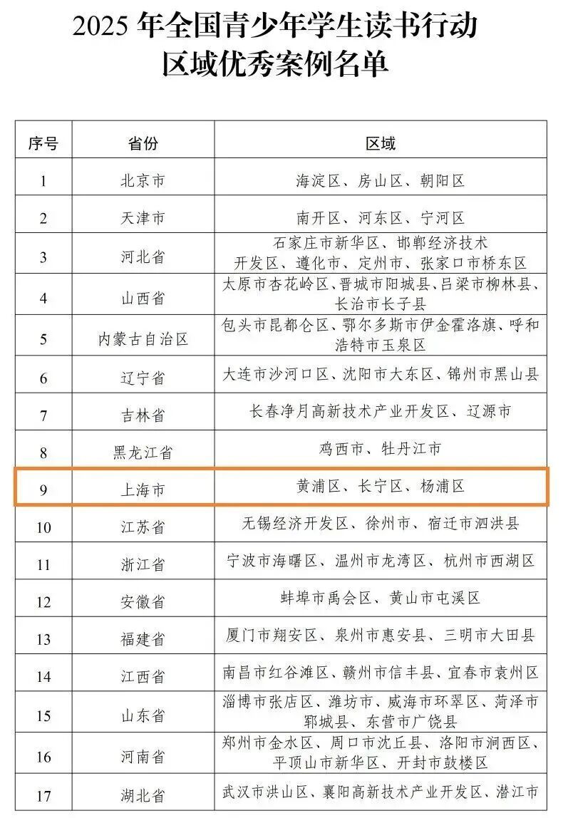 近日,在教育部公布的2025年全国青少年学生读书行动区域优秀案例名单上,黄浦区选送的案例《阅见黄浦 · 书香同行》榜上有名。