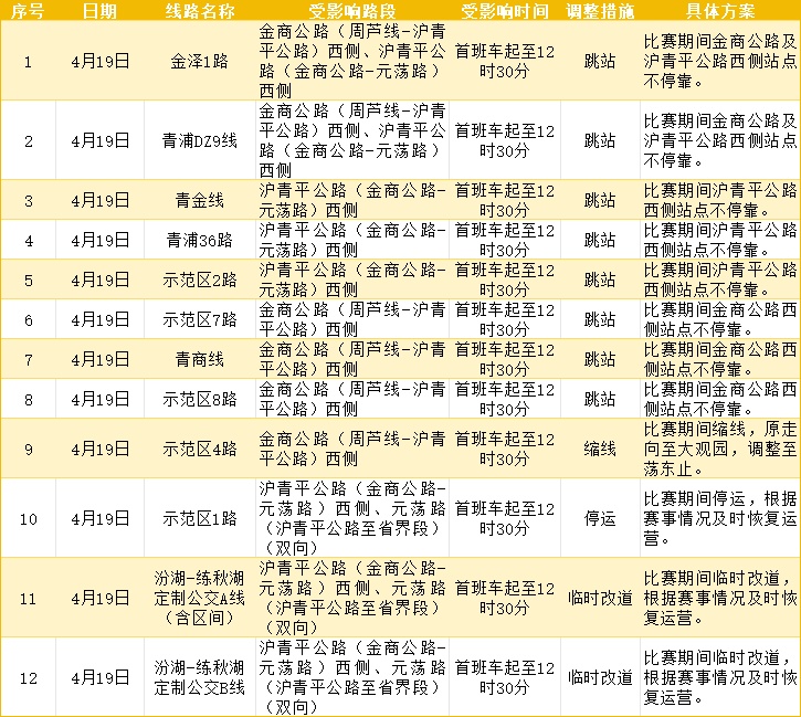 “2026长三角国际铁人三项赛”将于2026年4月18日至19日在青浦区大观园及周边区域举办,根据比赛线路走向及各路段交通管制安排,共有12条公交线路将采取临时调整措施,具体如下: