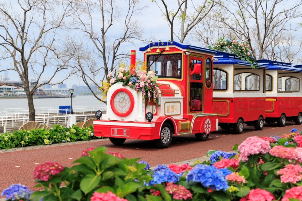花卉节限定小火车带你穿行前滩滨江,沿途尽览1.5公里绣球花道、喜林草花海之丘、月季园等特色景观,沉浸式感受滨江花海盛景。
