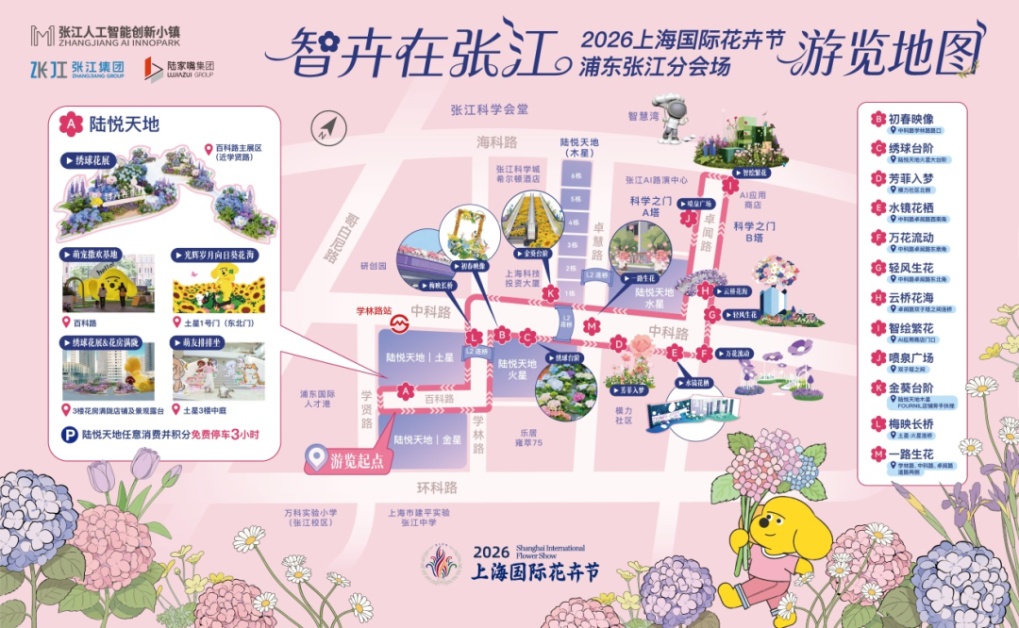 “智卉在张江”(4.24-5.31)以智慧科技为底色,在张江AI小镇核心区域设置科技元素的主题花艺装置,串联川杨河智慧湾、双子塔、陆悦天地三大节点,结合宠物友好,打造精品游览动线。