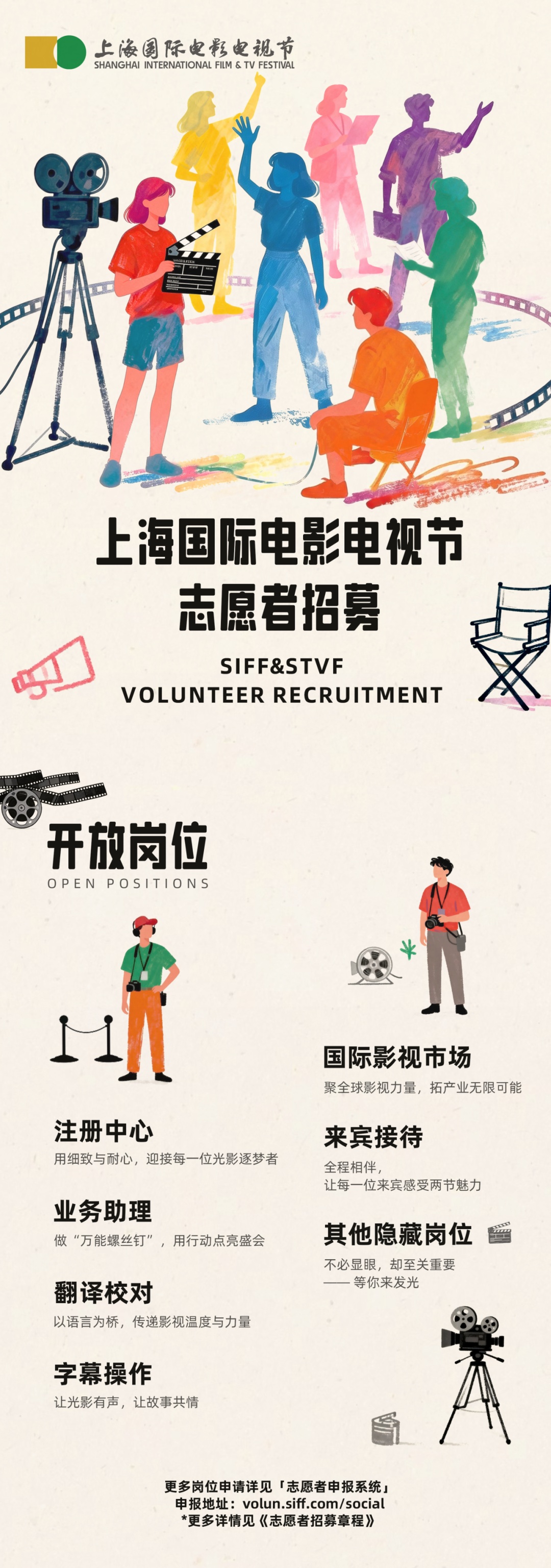 《2026年上海国际电影电视节志愿者章程》以及更多志愿服务岗位,可登录上海国际电影节官方网站(www.siff.com)或点击“阅读原文”查阅,报名请登录https://volun.siff.com/social进入报名通道。