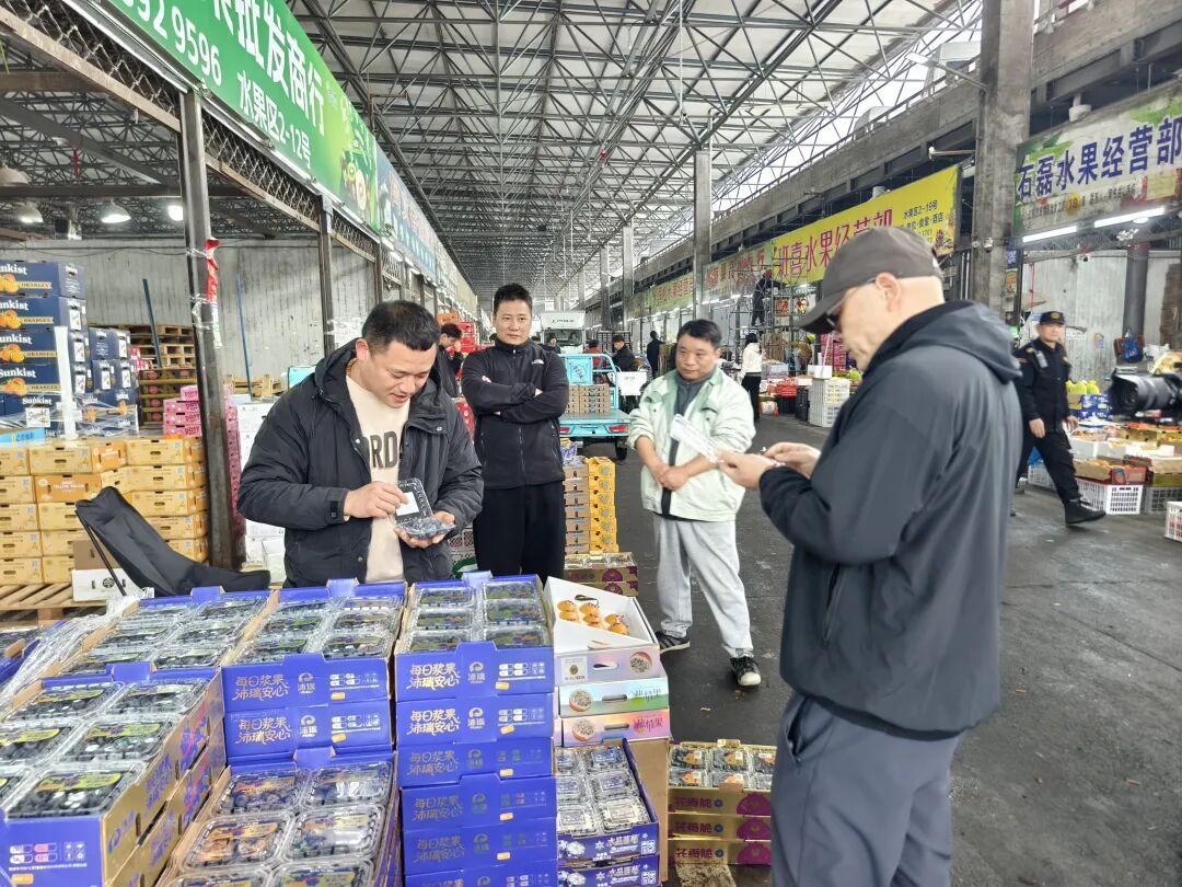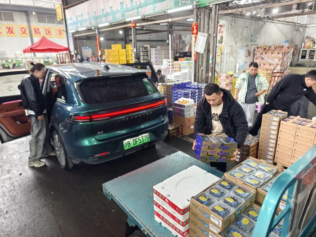 在江杨路批发市场果品区,小巧玲珑的蓝莓占据了不少热门档口。在这里,不时有市民过来挑选蓝莓,看品相,问价钱,有的还打开了尝一两颗,满意了再购买。有的买家采购量较大,开着私家车前来进货,谈好了价钱一箱一箱往车上搬,然后装车离去。