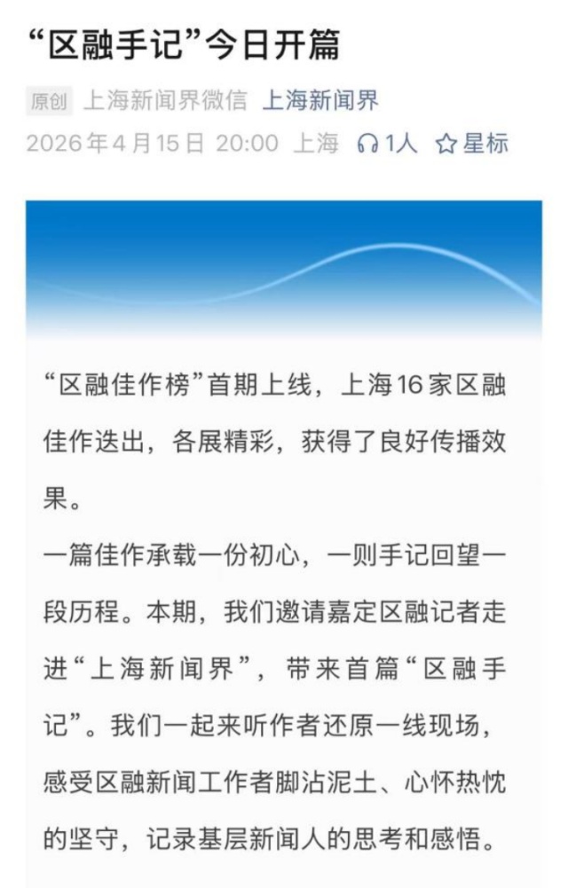 昨天晚上,上海市新闻工作者协会官方微信号“上海新闻界”发布推文《“区融手记”今日开篇》。推文指出,“区融佳作榜”于4月初首期上线后,上海16家区融佳作迭出,各展精彩,获得了良好传播效果。