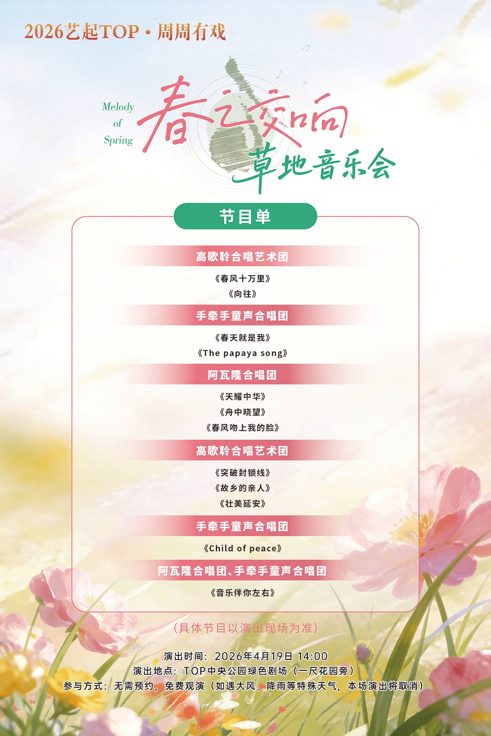 4月19日,艺起TOP·周周有戏——“春之交响”草地音乐会第五场将在TOP中央公园绿色剧场继续上演。本活动由普陀区文化和旅游局、桃浦镇人民政府、桃浦智创城开发建设有限公司共同主办,普陀区文化馆承办,普陀区绿化和市容管理局支持。 这场音乐会是高歌聆、阿瓦隆、手牵手等三支普陀区文化馆馆办合唱团联袂呈现的春日献礼。从银发苍苍的乐者,到朝气蓬勃的青年,再到歌声清澈的孩童,三代人将带来一场别开生面的文化盛宴。这个周末,诚邀您来TOP中央公园,一同拥抱歌声里的春天! 青年指挥家 武彦 武彦是上海市普陀区文化馆指挥干部、上海音乐家协会合唱专业委员会会员,毕业于上海音乐学院作曲指挥系,硕士研究生。她是一位艺术风格细腻、实战经验丰富的青年指挥家,深耕合唱指挥教学、排练与演出领域,多次带领合唱团斩获赛事大奖,曾荣获“优秀指挥”称号。 上海高歌聆合唱艺术团 上海高歌聆合唱艺术团(原名上海老年合唱艺术团)成立于1981年,由上海音乐学院声歌系教授、声乐教育家石林担任终身名誉团长,2025年12月正式进驻普陀区文化馆。这支深耕合唱艺术四十余年的“常青团队”,曾获上海市首届“百支优秀合唱团”称号,2025年更是摘得第五届“合唱之心”上海国际合唱比赛老年混声组金奖冠军,还先后登上《永远的长征》大型音乐会、SMG老年节文艺晚会等重磅舞台,用厚重清亮的和声,诉说岁月与时代的共鸣。 普陀区文化馆阿瓦隆合唱团 阿瓦隆合唱团成立于2016年3月,2021年6月成为普陀区文化馆馆办团队,从最初9位合唱爱好者的组合,发展为如今40人规模的中型合唱团。团员来自上海各行各业,已成功举办《So Nice》《四季歌》等六场专场音乐会,连续两届入选上海市民文化节“梦想合唱团”,凭借《海上歌潮》与原创作品《弄堂里的回声》两度斩获上海市群文新人新作展评展演“新作奖”,是普陀群众文化里的“潮流先锋”。 手牵手童声合唱团 手牵手童声合唱团是一支由6-12岁儿童组成的、以“携手同唱,未来共鸣”为口号、充满活力与创造力的童声音乐团体。2025年6月摘得“合唱之心”上海国际合唱比赛幼儿组金奖冠军,还曾与陆家嘴青少年乐团合作专场音乐会,用未染尘埃的稚嫩嗓音,把春天唱成蹦跳的音符。 演出信息 演出时间: 2026年4月19日14:00 演出地点: TOP中央公园绿色剧场(一尺花园旁) 参与方式:无需预约,免费观演(如遇大风、降雨等特殊天气演出将改期) 停车提示 公园内部停车场及敦煌路两侧。 春有约,花不误, 让我们以乐为媒,不负人间四月天!
