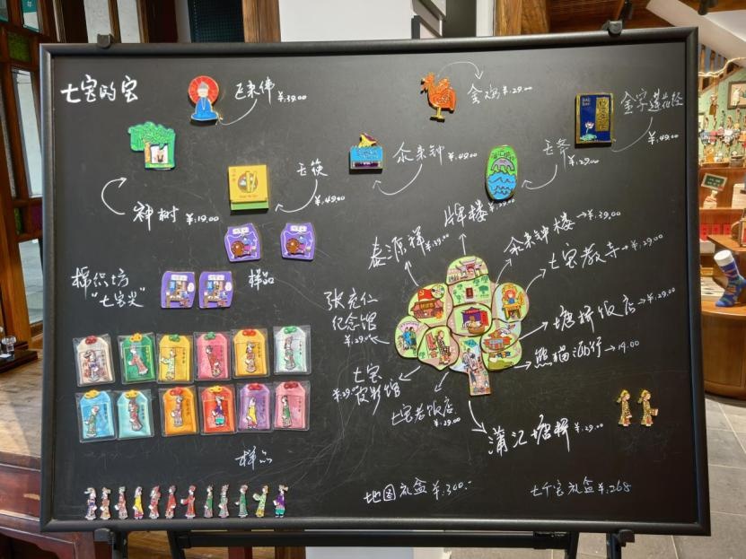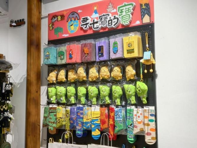店铺将古镇“七宝”典故(金字莲花经、氽来钟、飞来佛等)化作具象文创,冰箱贴、文创袜、手机链等好物兼具实用性与文化感,剪纸作品的充电宝、金山农村画为灵感的灵巧杯更让非遗技艺走进日常;更设非遗互动工坊,竹节包DIY、宋锦钱袋子制作等体验活动,搭配资深传承人坐镇的沉浸式非遗课堂,不定期推出非遗主题文创与优惠,让千年古镇文脉可触、可感、可收藏。