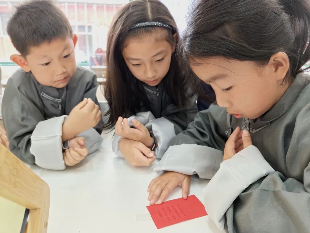 活动伊始,孩子们分组领取了编号各异的密码箱后,随即便投入到一场别开生面的“秘密情报传递”挑战之中。“洪波涌起千堆雪,炉火纯青铸剑心。”孩子们声情并茂地朗诵着革命誓词,尝试破解其中暗藏的数字线索,一步步走近诗词背后的英雄人物。