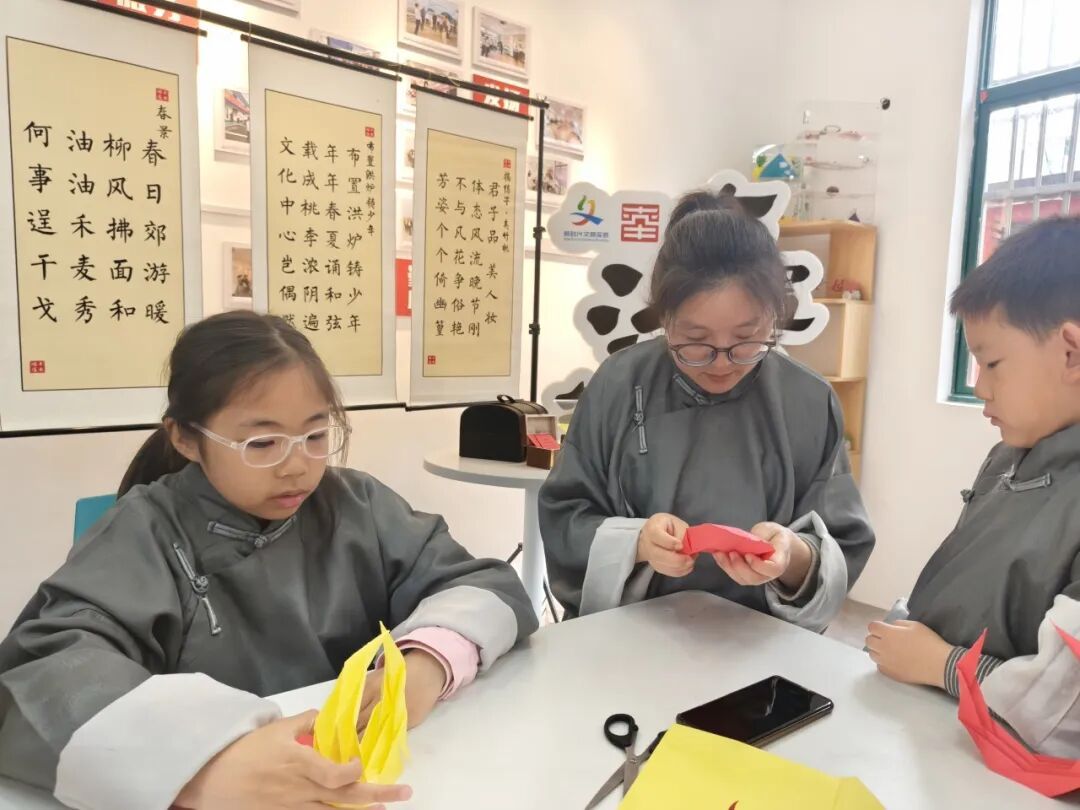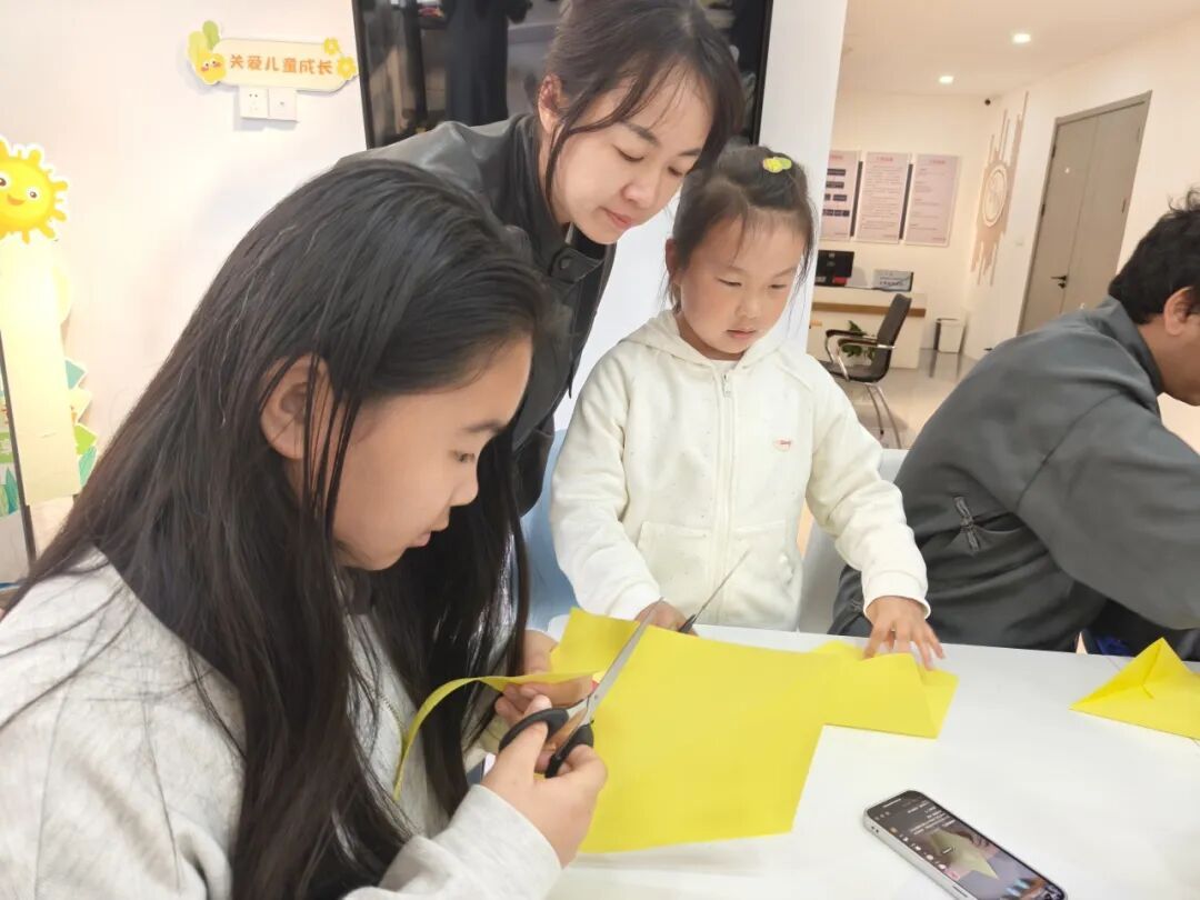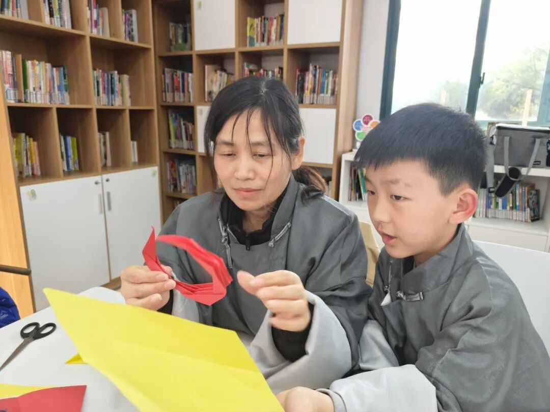 思辨之余,更要将敬意化为行动。亲子家庭共同制作五角星月亮船,以指尖匠心寄托对英烈的追思。