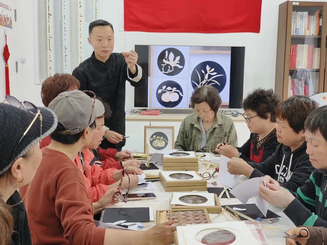 进入创作环节,居民在老师指导下耐心实践。大家根据画稿精心挑选麦秸秆,细心裁剪长度、调整弧度、对齐纹路,小心翼翼地粘贴定型。或简约线条,或花鸟图案,一片片普通的麦秸秆在指尖拼接组合,渐渐变成层次分明、质感独特的画作。