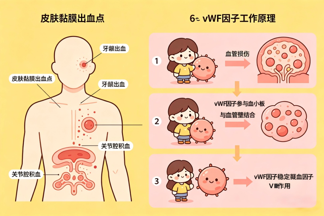 简而言之:体内缺少血管性血友病因子(vWF),或它 “功能不好”,导致血小板粘不住、凝血不稳,一出血就难止住。