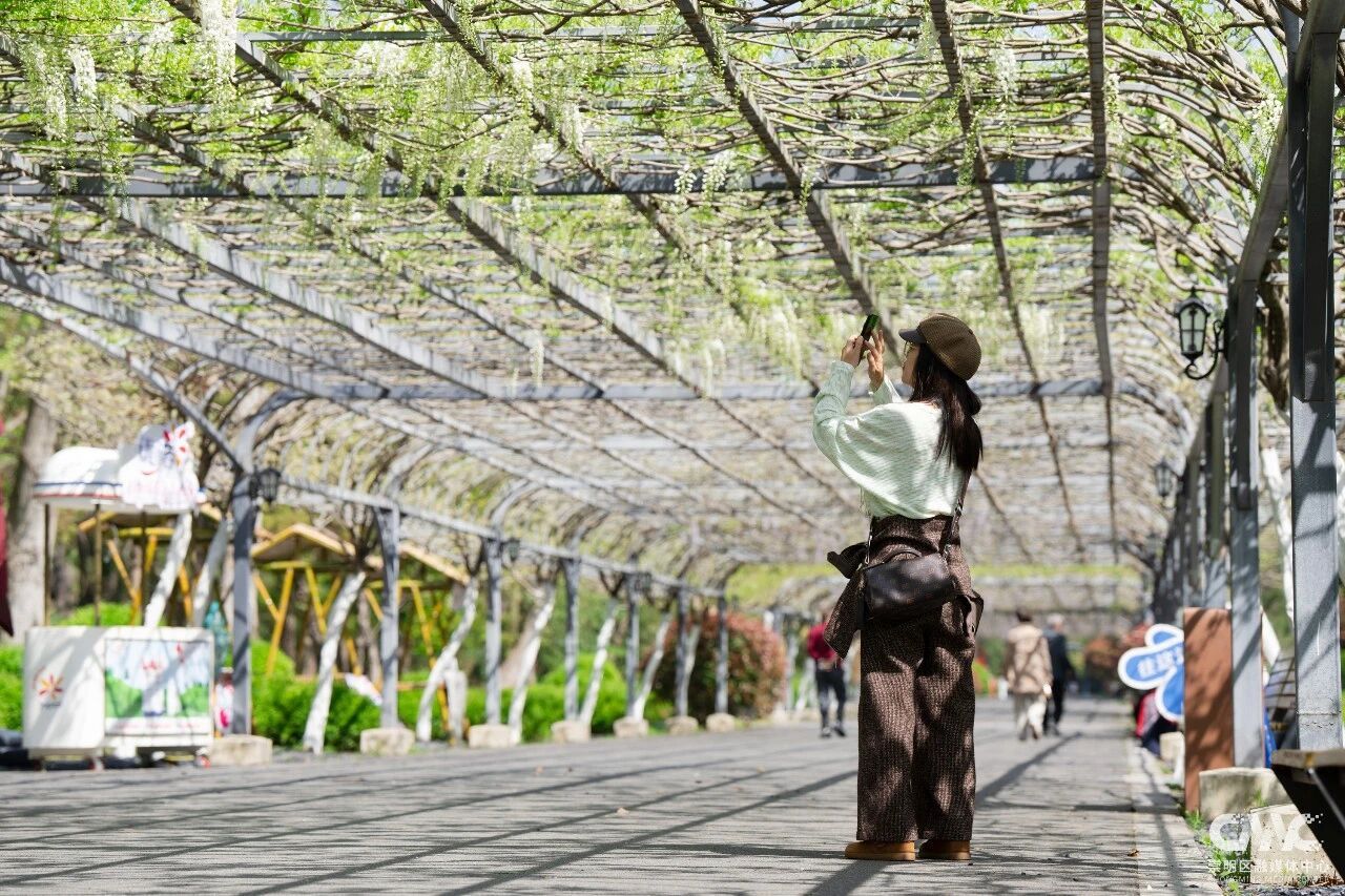微风轻拂,花香四溢,沁人心脾。游客纷纷驻足,在紫藤花下邂逅“一帘幽梦”,用手机定格美丽瞬间。