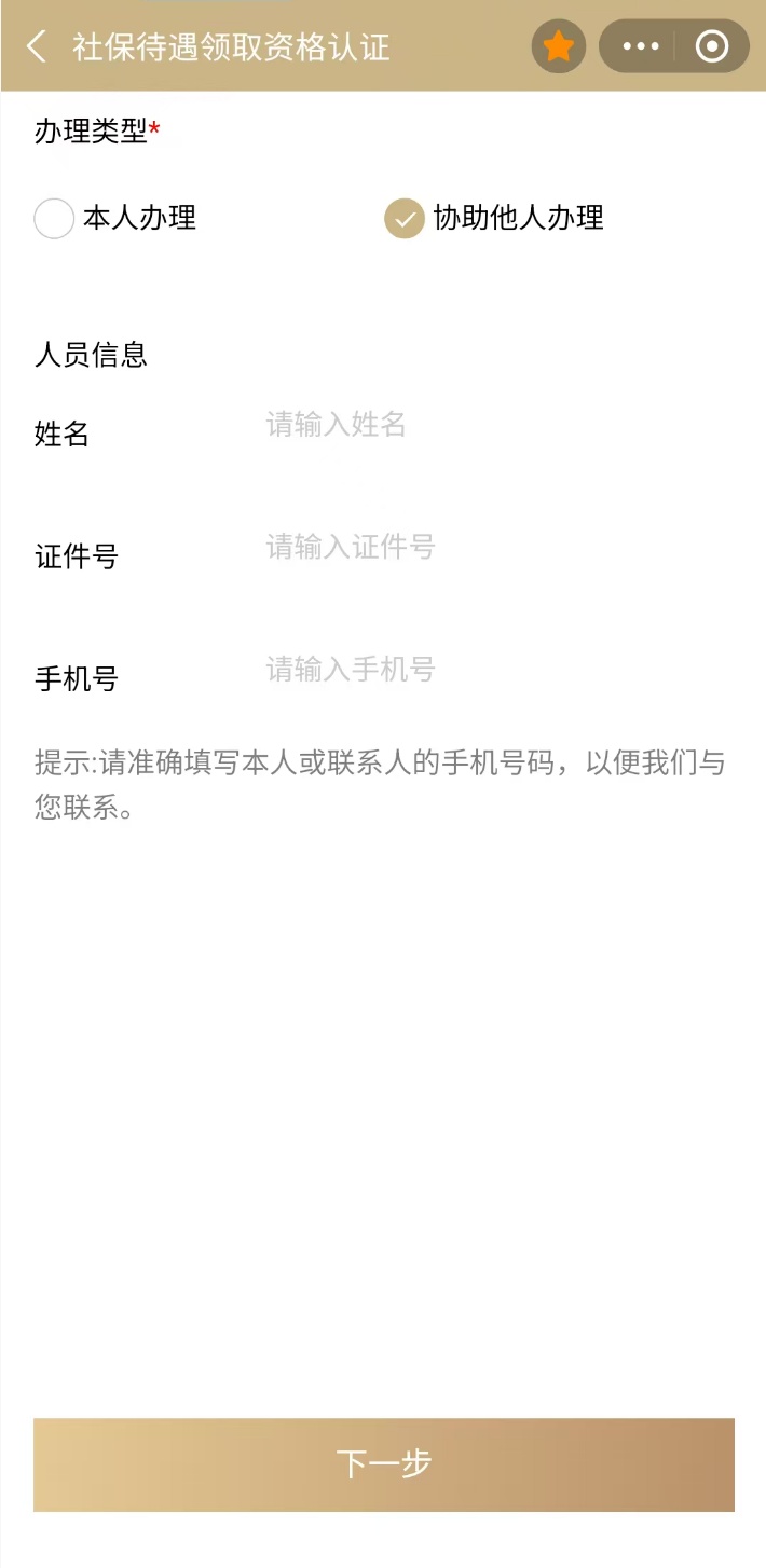 ②如需协助家人或朋友办理,办理类型请选择“协助他人办理”,准确录入他人的姓名、证件号和手机号码后,点击“下一步”。