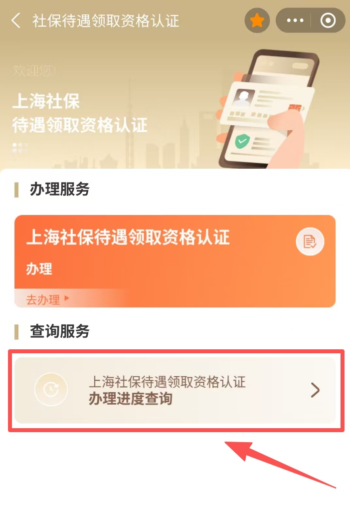 点击“上海社保待遇领取资格认证办理进度查询”,选择对应的查询类型(可以本人查询,也可为他人查询)。