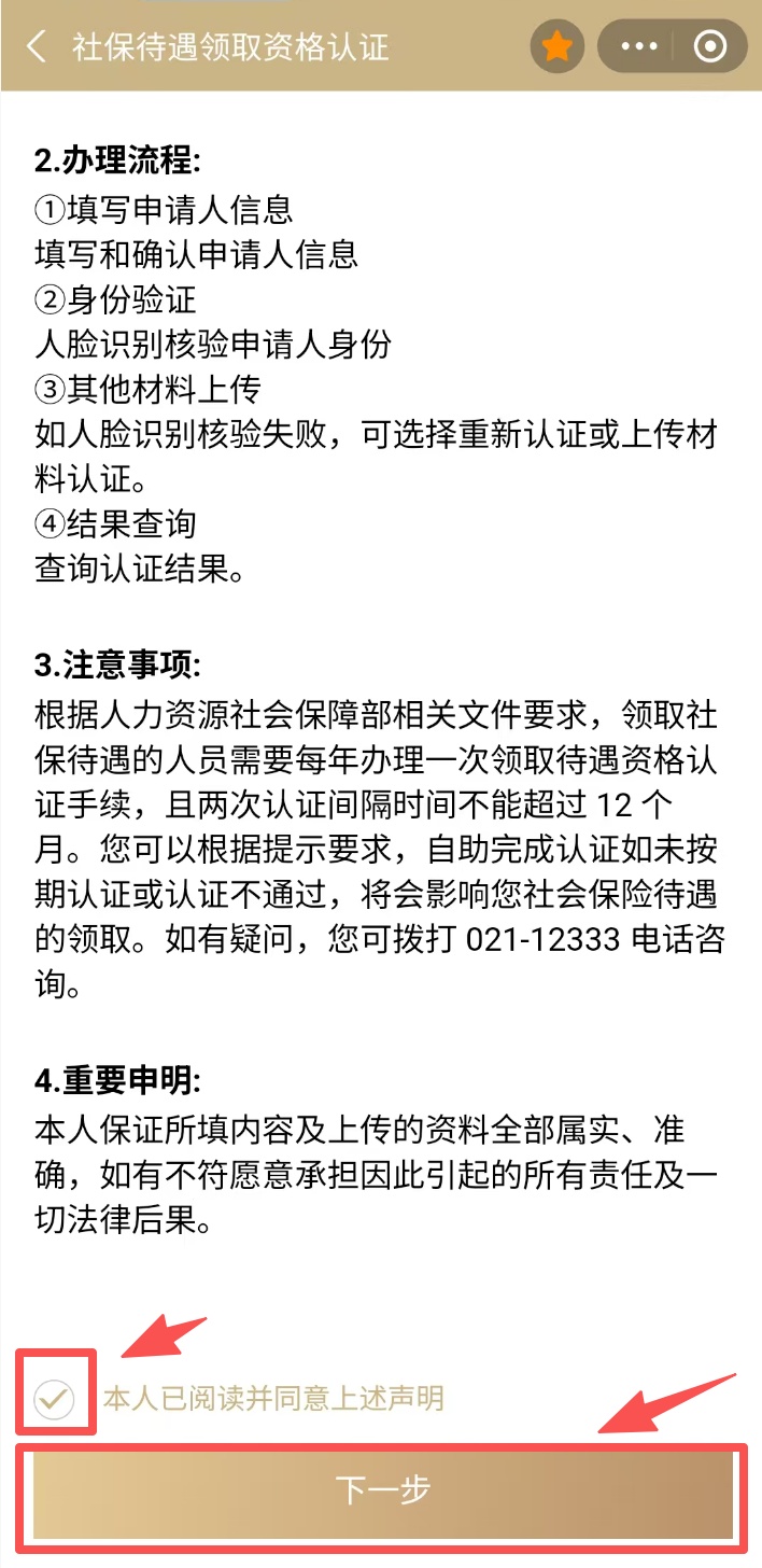 1、点击“上海社保待遇领取资格认证办理”,进入认证流程。认真阅读办理流程、注意事项和重要申明后,勾选“本人已阅读并同意上述声明”,并点击“下一步”。