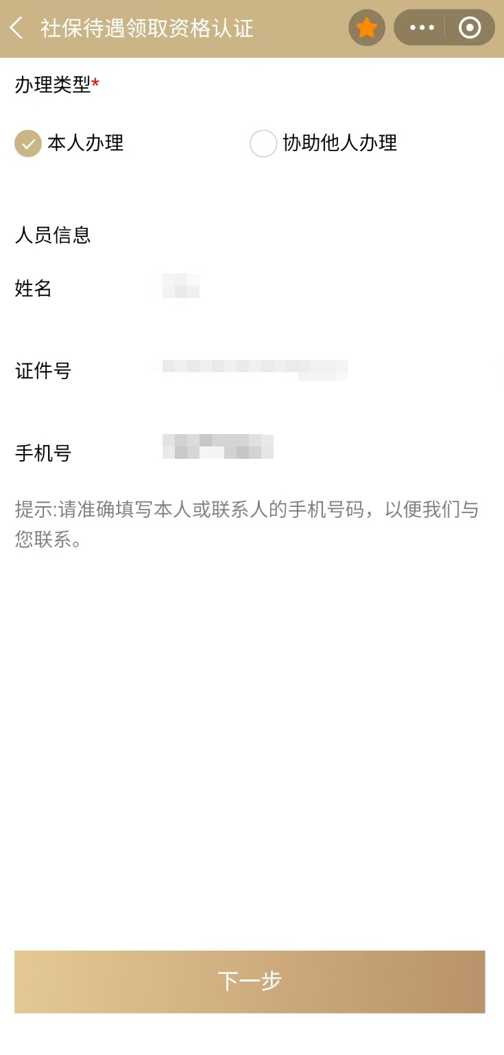 ①如为本人办理,办理类型请选择“本人办理”,系统将默认读取您当前登录的账户信息,确认无误后,点击“下一步”。