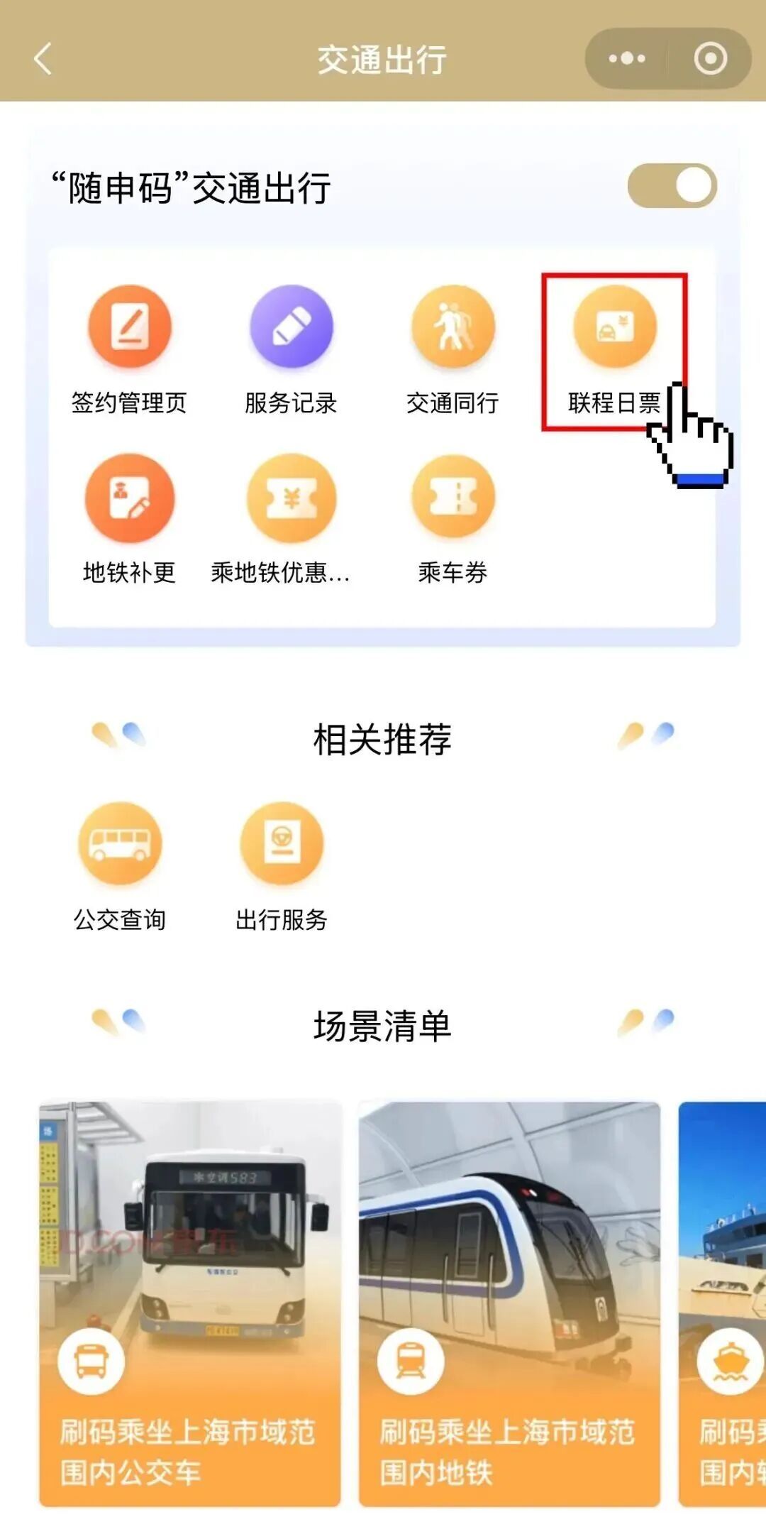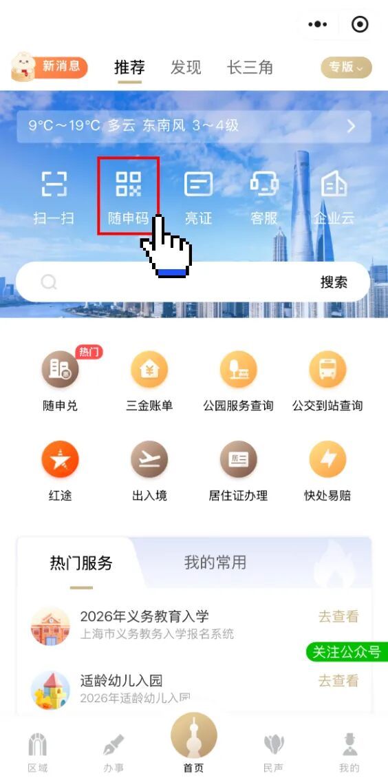打开“随申办市民云”(APP/微信小程序/支付宝小程序),首页点击「随申码」,开通交通场景配置,完成签约,即可使用。