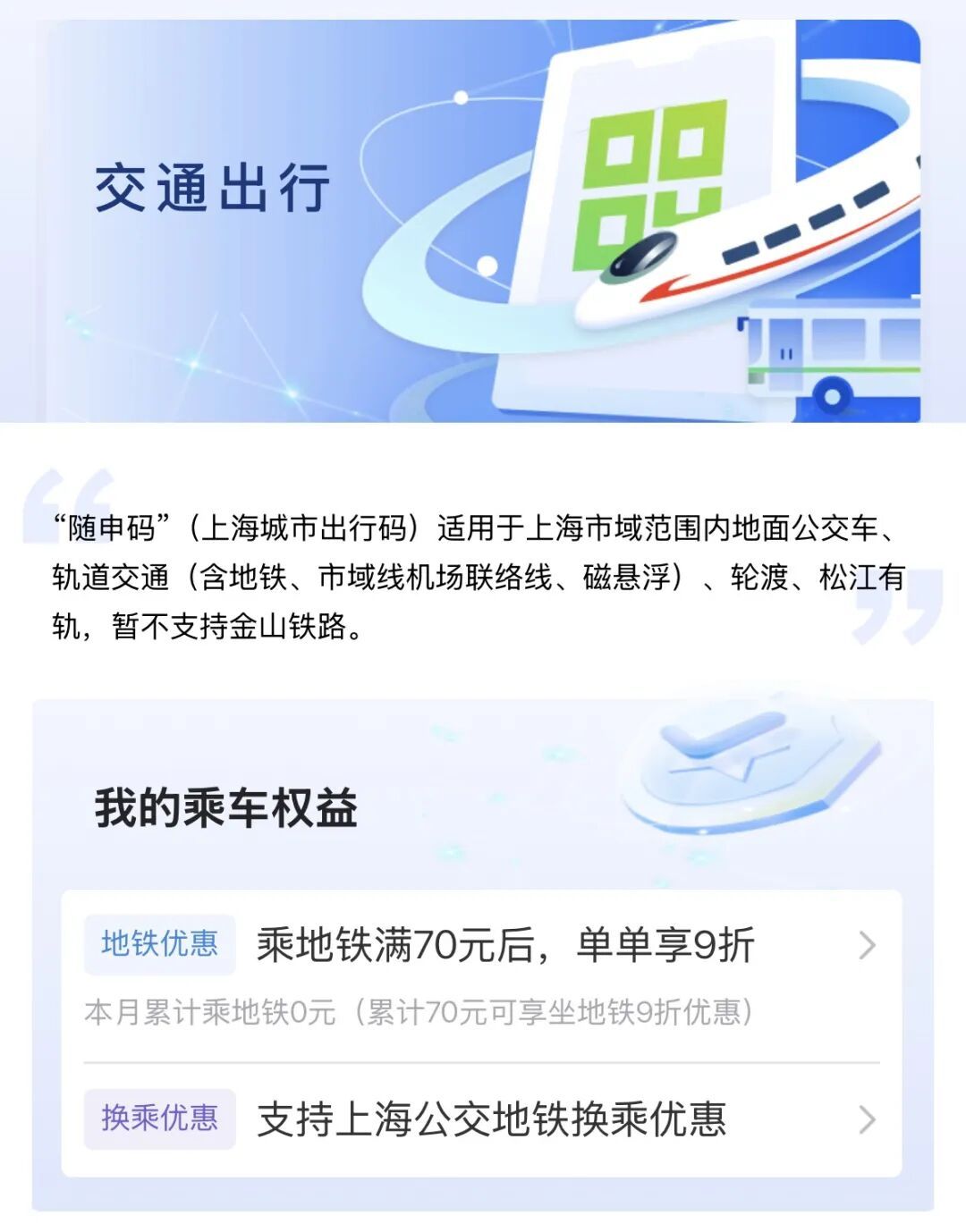 此外,使用「随申码」乘坐地铁,当月累计消费满70元后,还可享受9折的额外优惠。