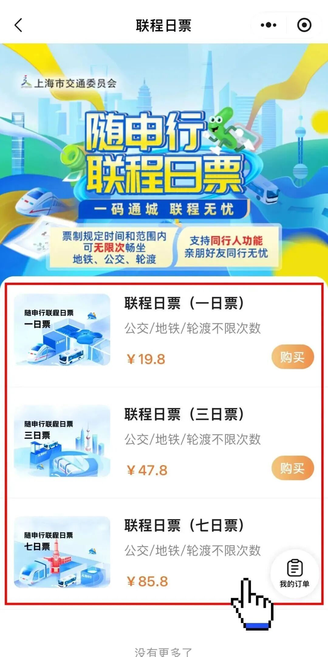 对于单日交通换乘累计费用超过19.8元的乘客,还可以选择购买以下三种“联程日票”:19.8元一日票、47.8元三日票、85.8元七日票。