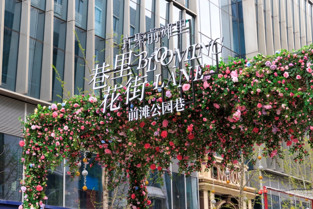 “卉聚前滩里”(4.18-5.10) 精心打造2公里赏花动线,串联前滩滨江公共空间和前滩公园巷、晶耀前滩、前滩太古里,将自然生态和都市繁华有机结合。