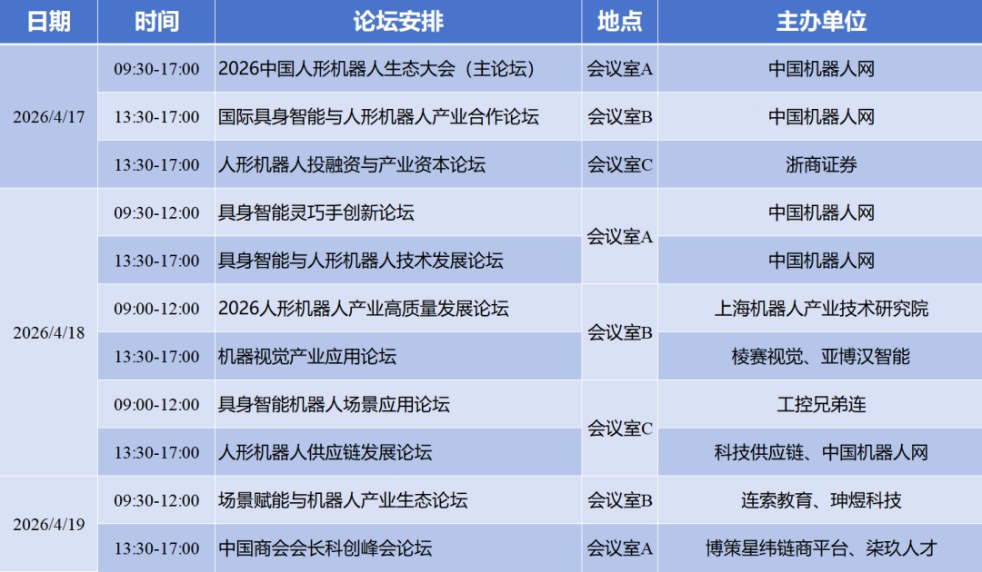 除了前沿产品,大会同期还将举办1场主论坛和10场分论坛,覆盖技术研发、产业发展、市场拓展、投融资及场景应用等关键领域,全方位打通从零部件供应、本体制造到终端应用的产业链条。