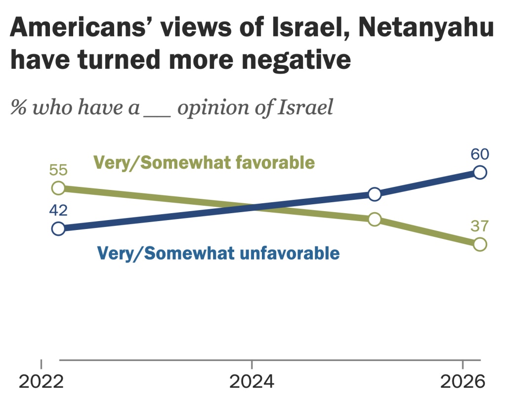 2025年前后,美国公众对以色列的态度出现了一个足以进入思想史视野的拐点。皮尤研究中心2025年4月的调查显示,百分之五十三的美国成年人对以色列持负面看法,共和党内部这一比例也从百分之二十七升至百分之三十七,而五十岁以下共和党人对以色列的负面看法已达百分之五十。到2025年10月,皮尤进一步发现,美国公众对“以色列政府”的负面评价已高于对“以色列人民”的评价,百分之五十九的美国人对以色列政府持负面看法,美国对以色列的同情度降至二十五年来最低点。到2026年2月,盖洛普首次测得美国总体上“更同情巴勒斯坦人”的比例达到百分之四十一,超过“更同情以色列人”的百分之三十六;在三十五至五十四岁年龄组中,这一差距更扩大到百分之四十六对百分之二十八。2026年春以来,美以对伊朗战争的持续升级又进一步放大了这一冷却趋势。