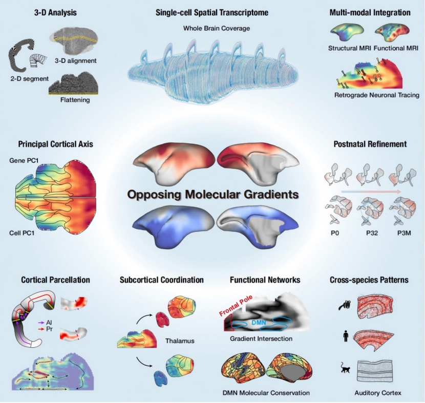 如今,借助整合空间转录组学、磁共振成像与逆向神经示踪等多模态技术,中国科学院脑科学与智能技术卓越创新中心刘赐融研究组和孙怡迪研究组、杭州华大生命科学研究院副研究员郝世杰、澳大利亚莫纳什大学教授马塞洛·罗萨(Marcello Rosa )团队合作,在皮层中定位了两个起源相反、方向对立的“起始点”,有趣的是这两个“起始点”正好对应了初级感觉皮层和旧皮层。这一新发现意味着之前的两大假说各自道出了“真相”的一半,两者融合才是完整的“答案”。而两个“起始点”的细胞在发育过程中逐渐精细化,构成了一个连续的、覆盖全脑的“分子梯度轴”,并在交汇和平衡部分形成了负责高级认知功能的联合皮层。4月17日,相关论文登上了《科学》杂志。
