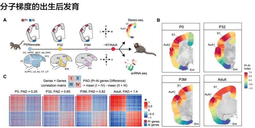 这两条梯度呈现显著的负相关,而联合皮层则位于这两条梯度的交汇区,表现出混合的分子特征。这种分子特征的对立在整个大脑皮层表面形成了一个连续的、覆盖全脑的“Pr-Al分子梯度轴”。该梯度轴不仅是灵长类大脑皮层细胞类型和基因表达空间分布的主导维度,该梯度在局部空间上的剧烈跃变也界定了皮层区域的解剖边界。进一步发育分析显示,Pr-Al分子梯度轴并非在成年期才突然出现,而是作为一种先天的“原始蓝图”,在出生时即已存在雏形。在出生后的发育过程中,该梯度经历了一个显著的“精细化”过程。随着大脑的发育,Pr与Al两极的分子特征差异显著增强,原本相对弥散的基因表达模式逐渐“锐化”,形成了成年期界限分明的分布格局。