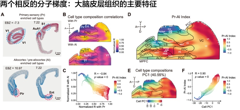依托这一高精度的全脑整合图谱,研究团队对细胞类型和基因表达的空间分布进行了深入分析。研究显示,皮层中的特异性基因和细胞类型并非随机分布,而是受控于一个全皮层尺度的“相反分子梯度”。其中,初级感觉梯度(Pr)锚定于初级感觉皮层(包括初级视觉皮层、初级听觉皮层和初级躯体感觉皮层),向联合皮层方向逐渐减弱;异皮质梯度(Al)锚定于边缘皮层/边缘旁皮层(包括内嗅皮层和梨状皮层),同样向联合皮层方向递减。