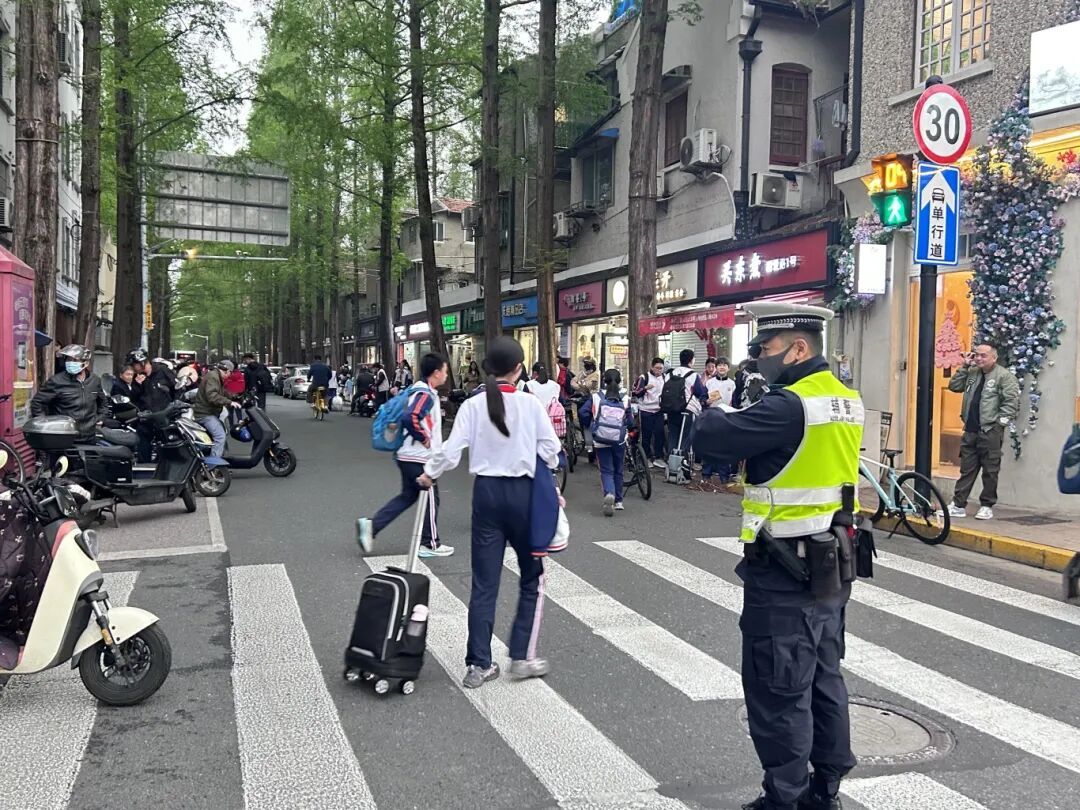 现场有辅警全程值守疏导,引导学生安全过马路、家长规范停车,人车各行其道,原本拥堵的路口变得畅通有序。