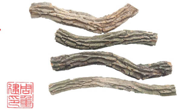 钩吻(断肠草):藤茎呈不规则圆柱形,弯曲扭转状,长短不一,少分枝。表面浅灰色、灰棕色或浅棕色,具纵皱纹,皮部呈片状开裂而显露木部。质坚硬,不易折断。断面不整齐,皮部类白色或淡黄色,近木部颜色较深,木部黄色,可见放射状纹理、细孔及年轮。气特异,味辛苦。