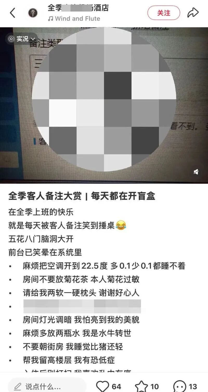 涉事账号“全季大连xx酒店”将多名客人的特殊订单备注公开发布,包括“房间不要放菊花茶,本人菊花过敏”“麻烦多放两瓶水,我是水牛转世”“外卖别敲门,放门口,我在修仙勿扰”等内容,配文称“每天被客人备注笑到捶桌”“前台已笑晕在系统里”。