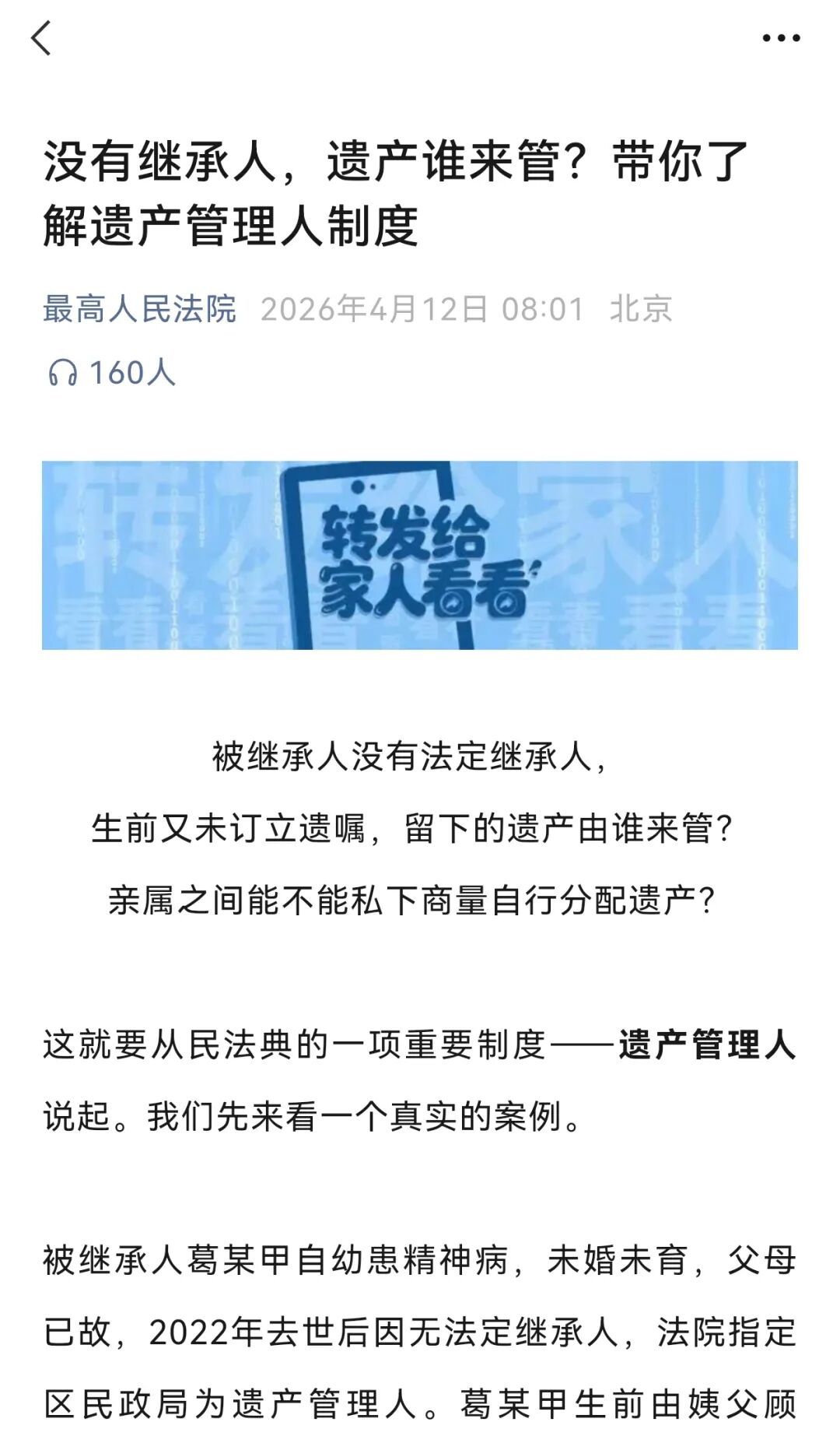 3. 找个“托底人”:如果身边没有合适的人,可以提前和民政部门沟通,了解当地遗产管理人的指定流程。法律已经为无人继承的情况设计了兜底机制,但提前了解、提前安排,总比事后被动应对强。