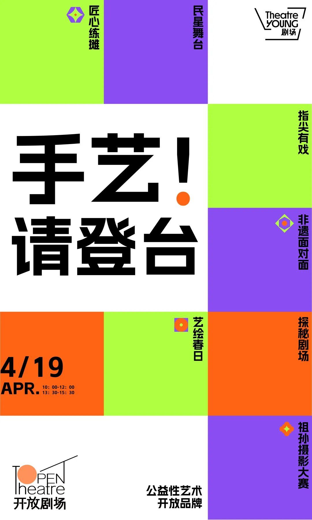去年四月,YOUNG剧场与邻里在“邻里剧场·记忆共生”中相遇,打破剧场与社区的边界,成为去年春日最珍贵的注脚。 今年四月,YOUNG剧场携手控江路街道社工办、社区文化中心、社区睦邻中心携手,以“手艺!请登台”为主题,于本周日(4月19日)重启开放剧场的叙事。 寻常巷陌间,总藏着不寻常的璀璨。市集、演出、非遗展览、手艺体验、剧场探秘、麦秆画共创、祖孙摄影大赛……一整天的精彩将陆续展开。期待你与巷里的手艺人相遇、交流,在剧场与社区之间,共写这个春日的新篇。