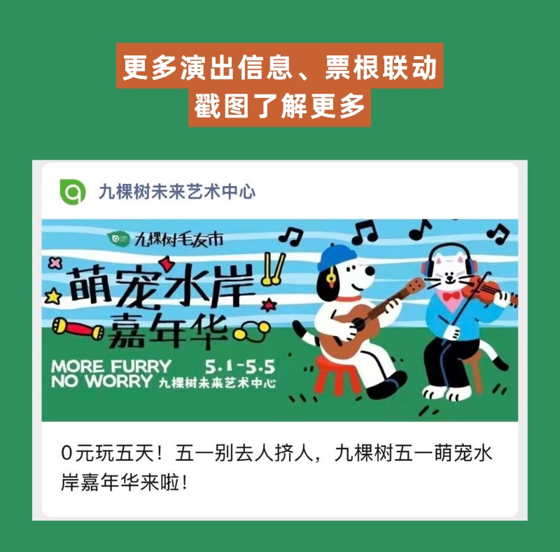 1、九棵树萌宠系列活动所有场次为宠物友好,是爱宠人士的共同努力,才能实现萌宠进入剧院,因此,请保证爱宠的情绪稳定,以免伤到其它爱宠及家长。