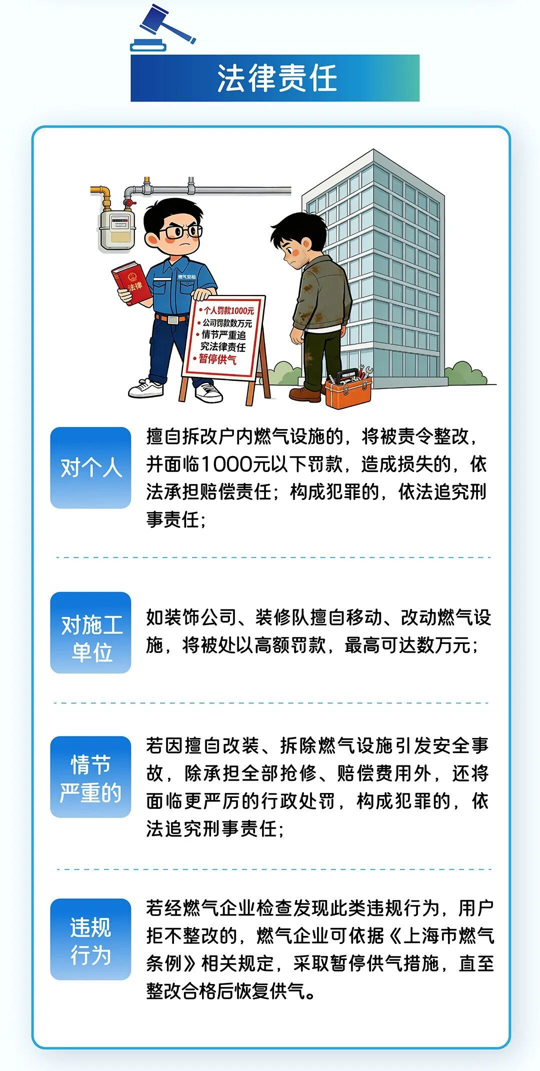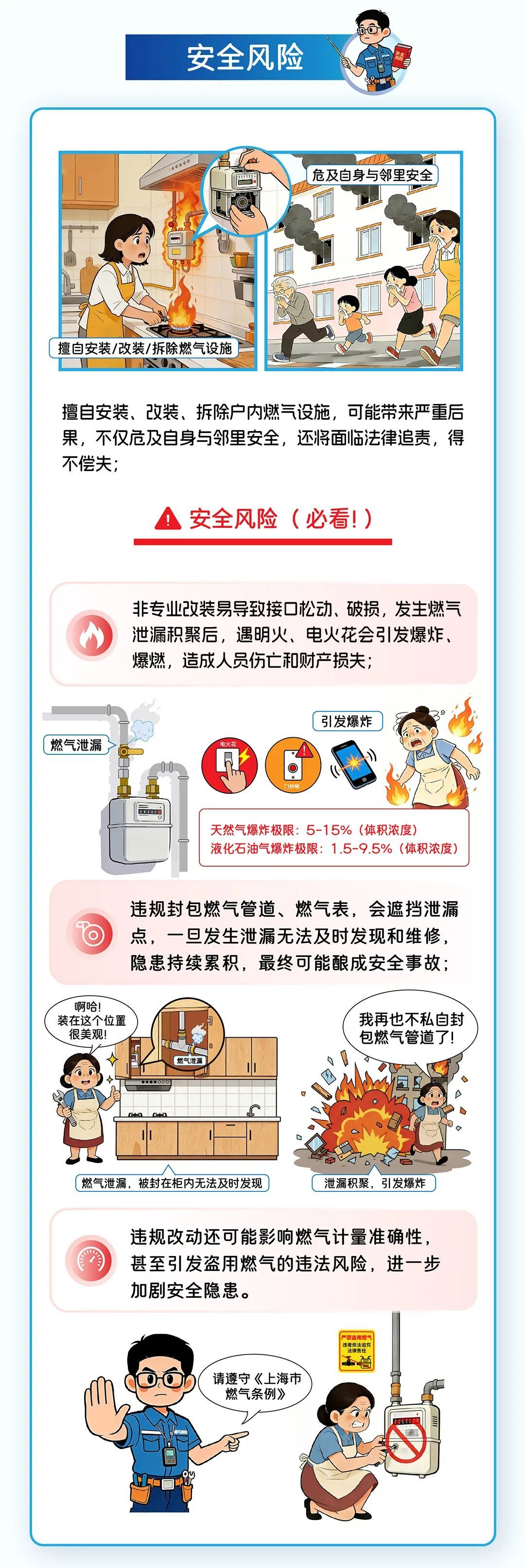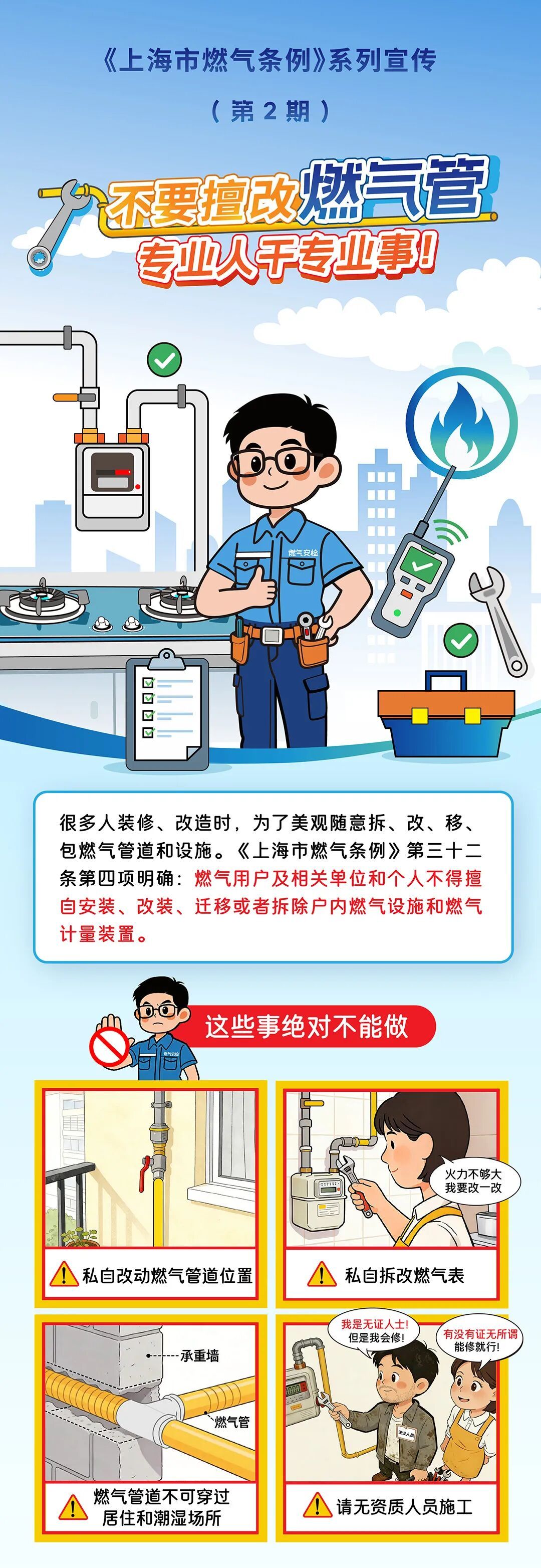 为方便市民读懂、用好《上海市燃气条例》,我们聚焦入户安全检查、燃气设施保护、燃气器具安全等重要内容,特别推出燃气条例普法系列科普。本期为大家带来系列科普第二篇:不要擅改燃气管,专业人干专业事。一起来看图解↓