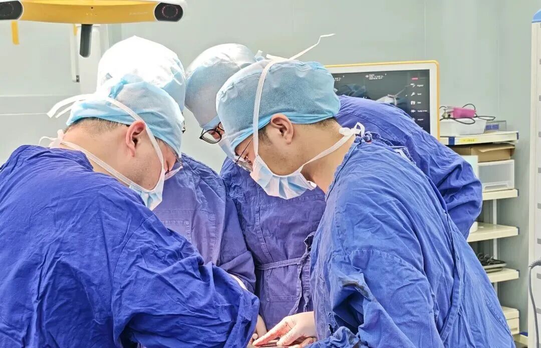 小张进入手术室时血红蛋白仅为37g/L,留给团队的操作空间极其有限。面对如此极端的情况,钟来平教授团队判断,手术必须多线同步推进,为患者争取时间。口腔颌面头颈外科钟来平教授与朱东旺副主任医师、赵铜超主治医师在颅外争分夺秒剥离肿瘤,张茂林主治医师、杨唐艺雯医师在患者大腿制备股前外侧皮瓣,为缺损重建做好准备。麻醉科曹莉医生在患者极端贫血的状态下全力维持循环。
